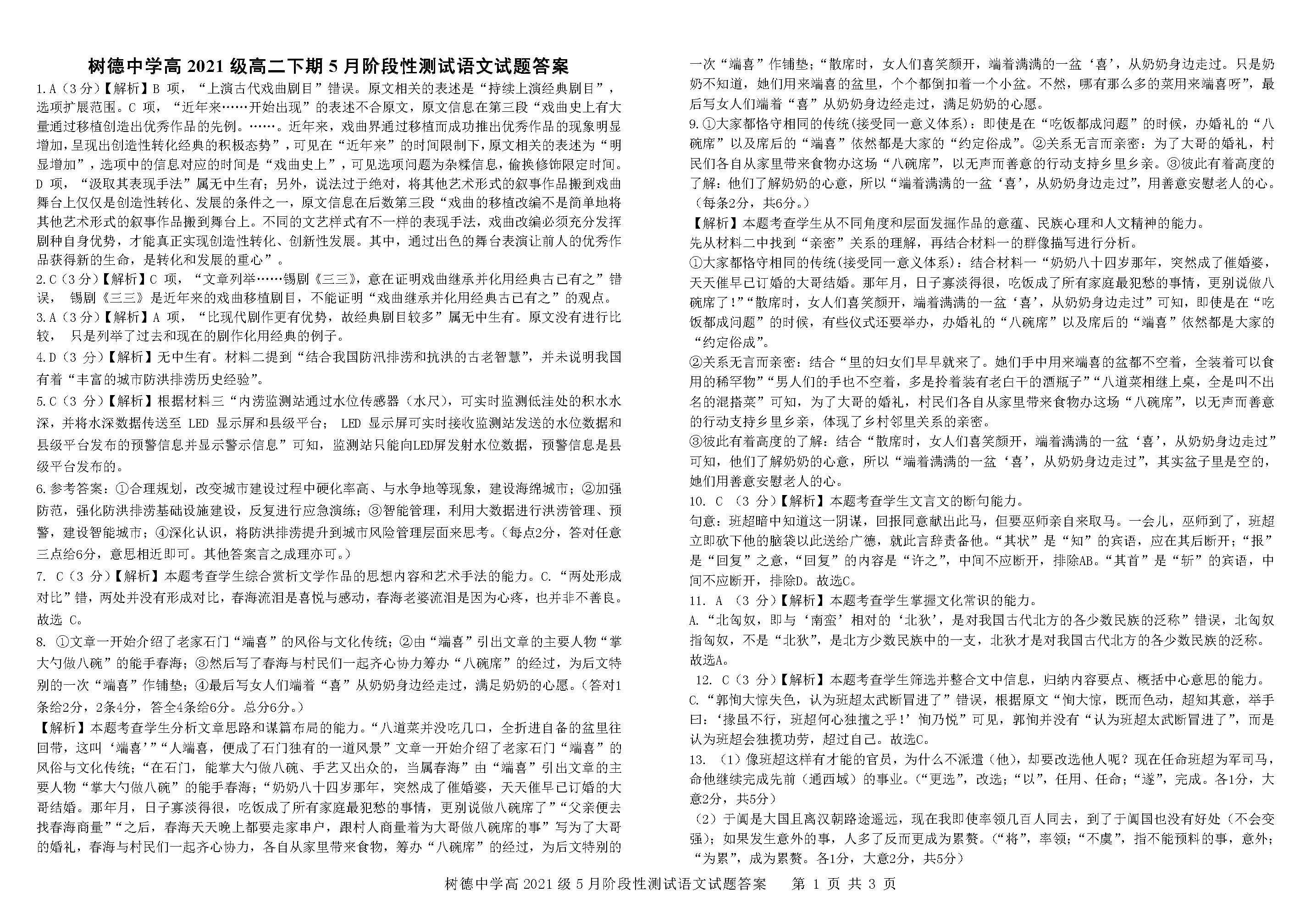 四川省成都市树德中学2023届高二5月月考语文答案