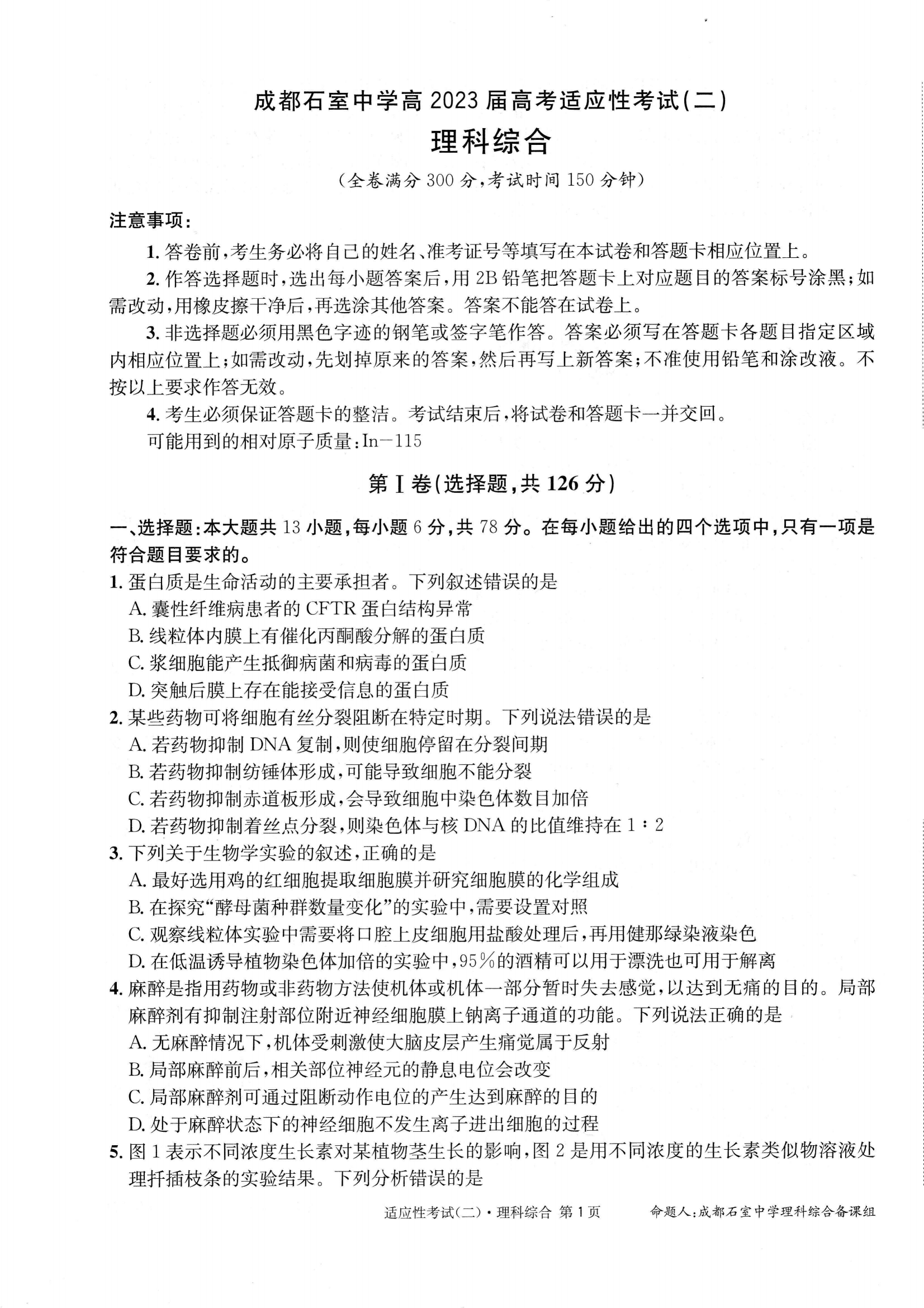 2023成都石室中学高考适应性考试(二)于近期开考,为方便大家巩固练习,自主选拔在线四川新高考团队整理了2023成都石室中学高考适应性考试(二)理综试题及参考答案,供大家下载。