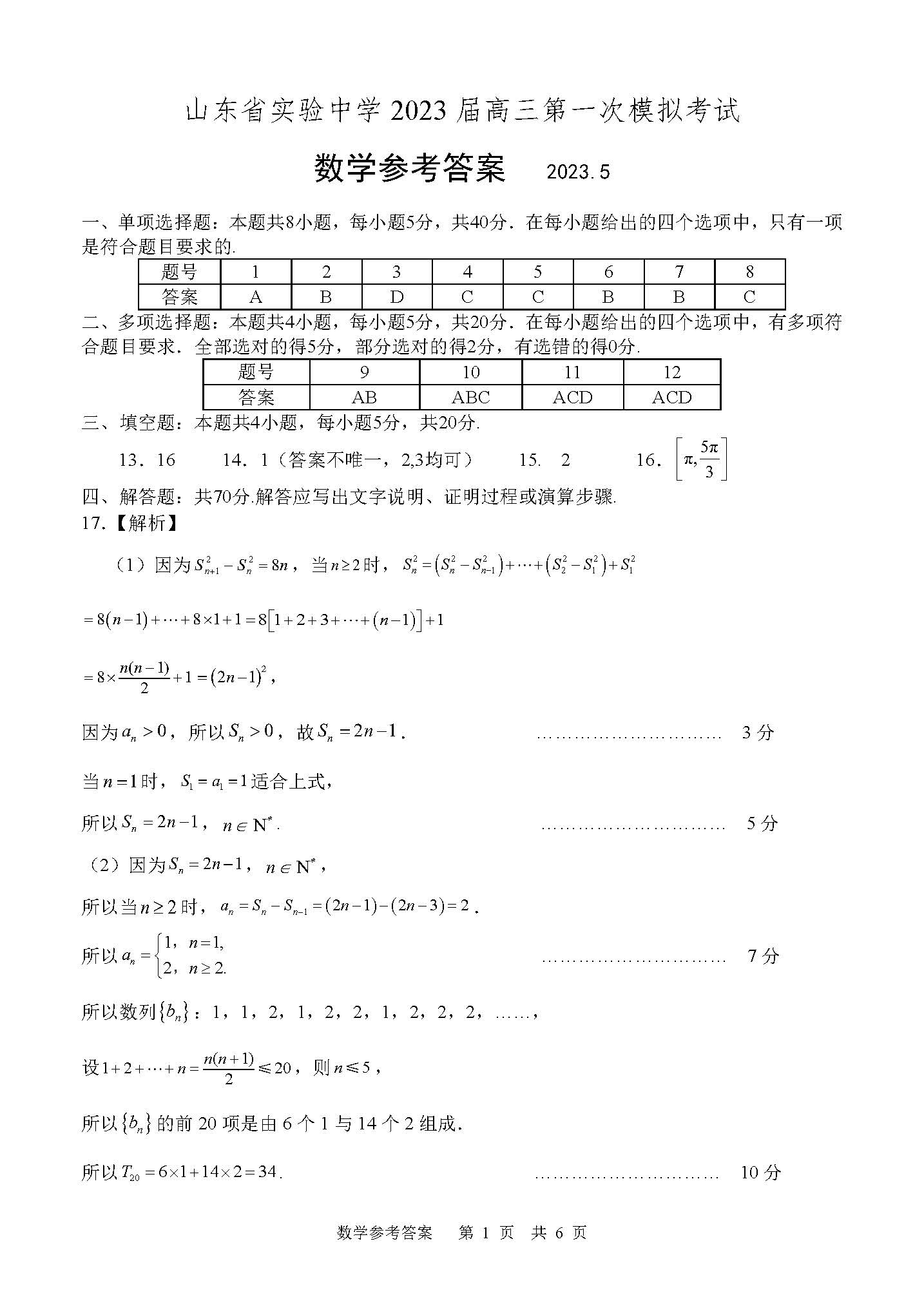 立即下载:山东省实验中学2023届高三第一次模拟考试数学答案