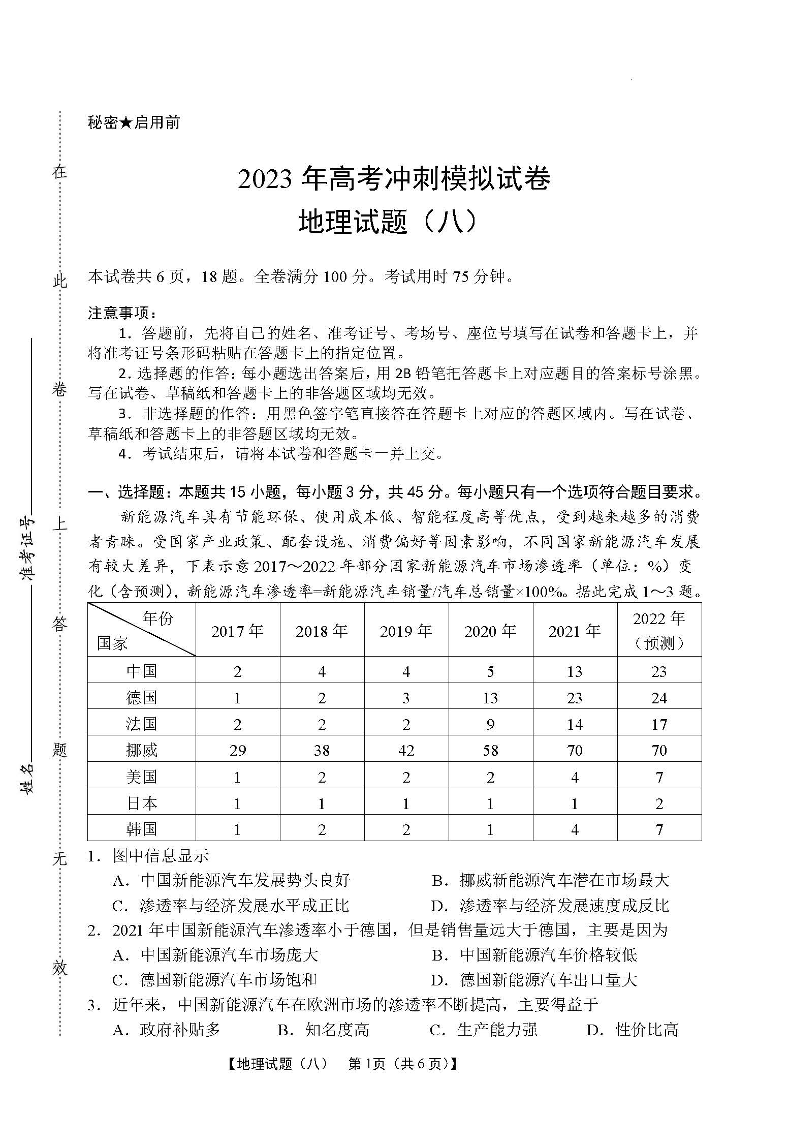 湖北省2023届高三高考冲刺模拟试卷(八)地理试题