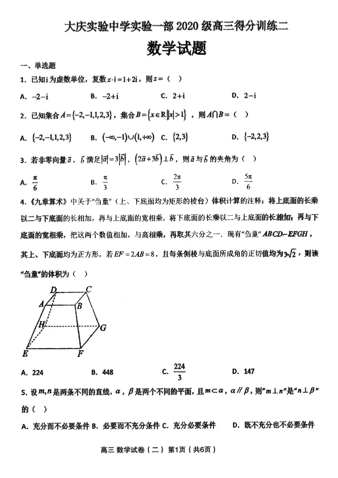 黑龙江省大庆实验中学2023届高三考前得分训练(二)数学试题