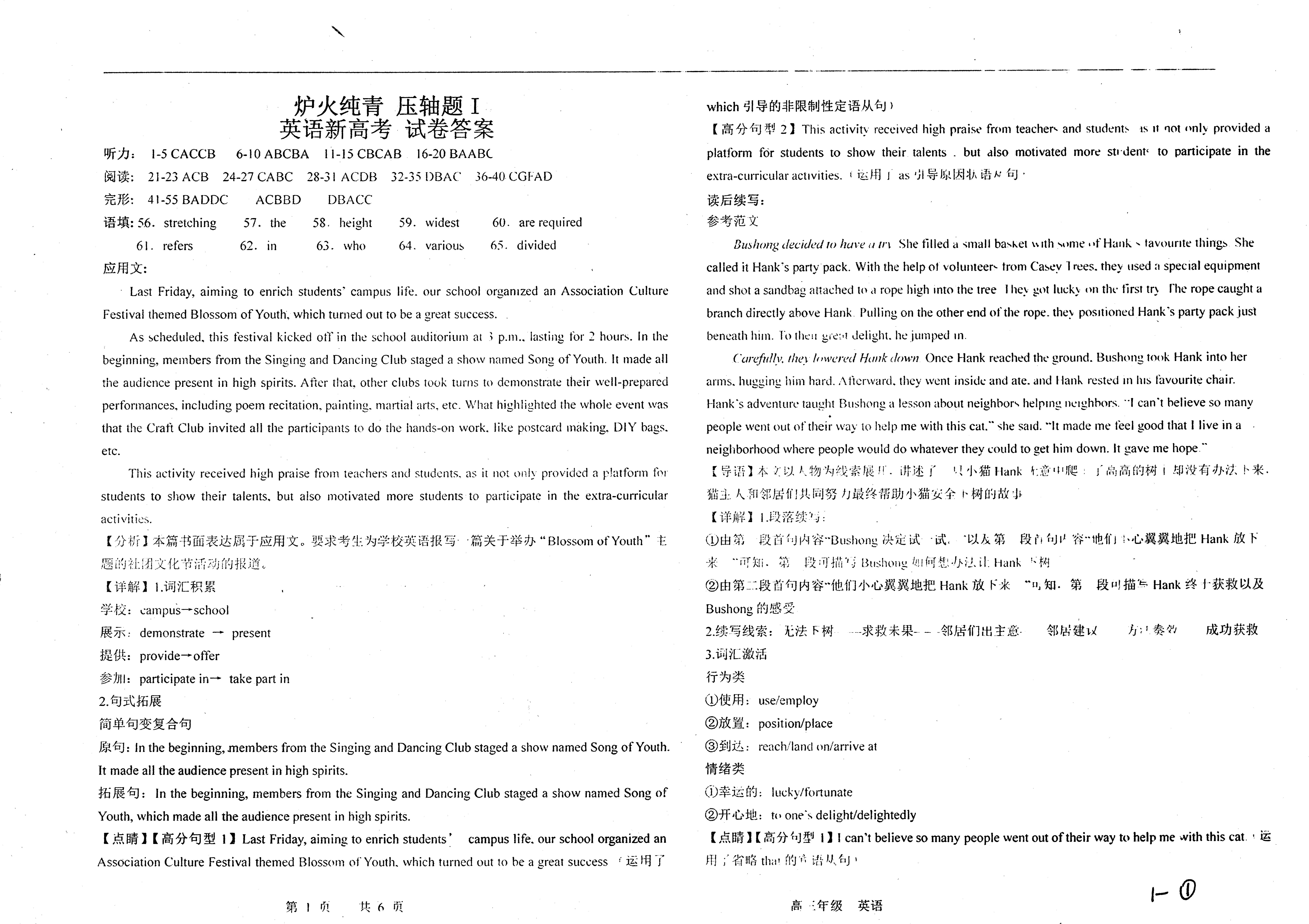 河北省衡水中学2023届高三考前自主复习密卷(押题一)英语答案