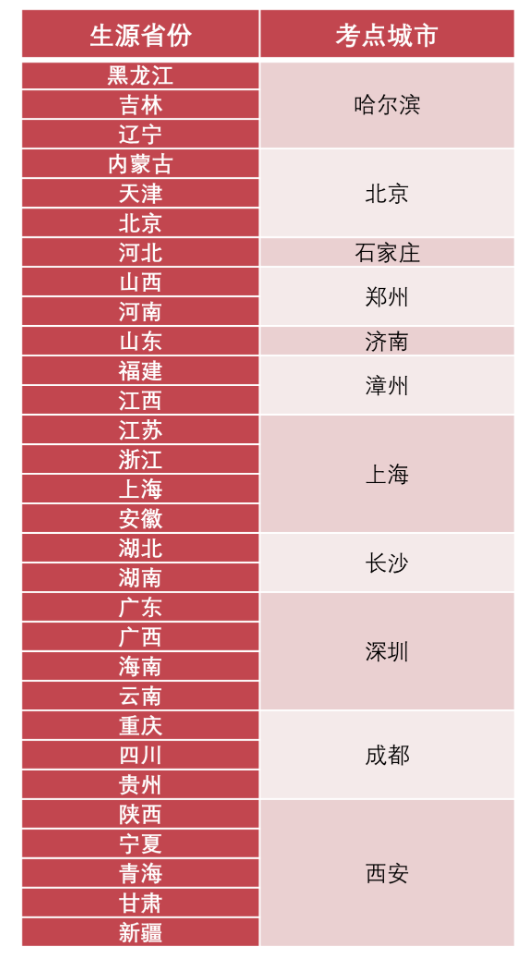 考核地点:哈尔滨工业大学根据考生生源省份设定若干考点,具体考点城市见下表: