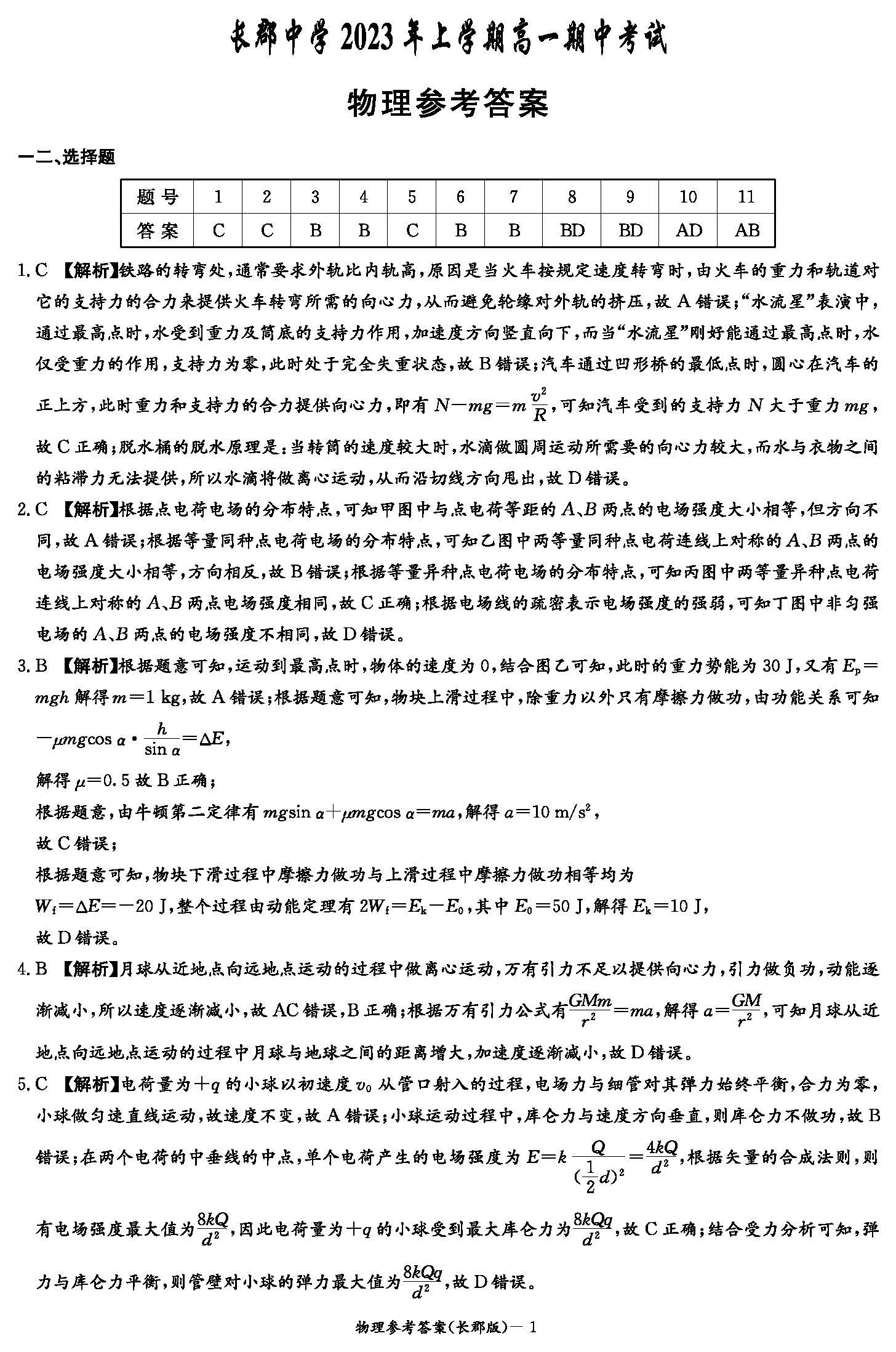 湖南省长沙市长郡中学2023学年高一下期中考试物理答案