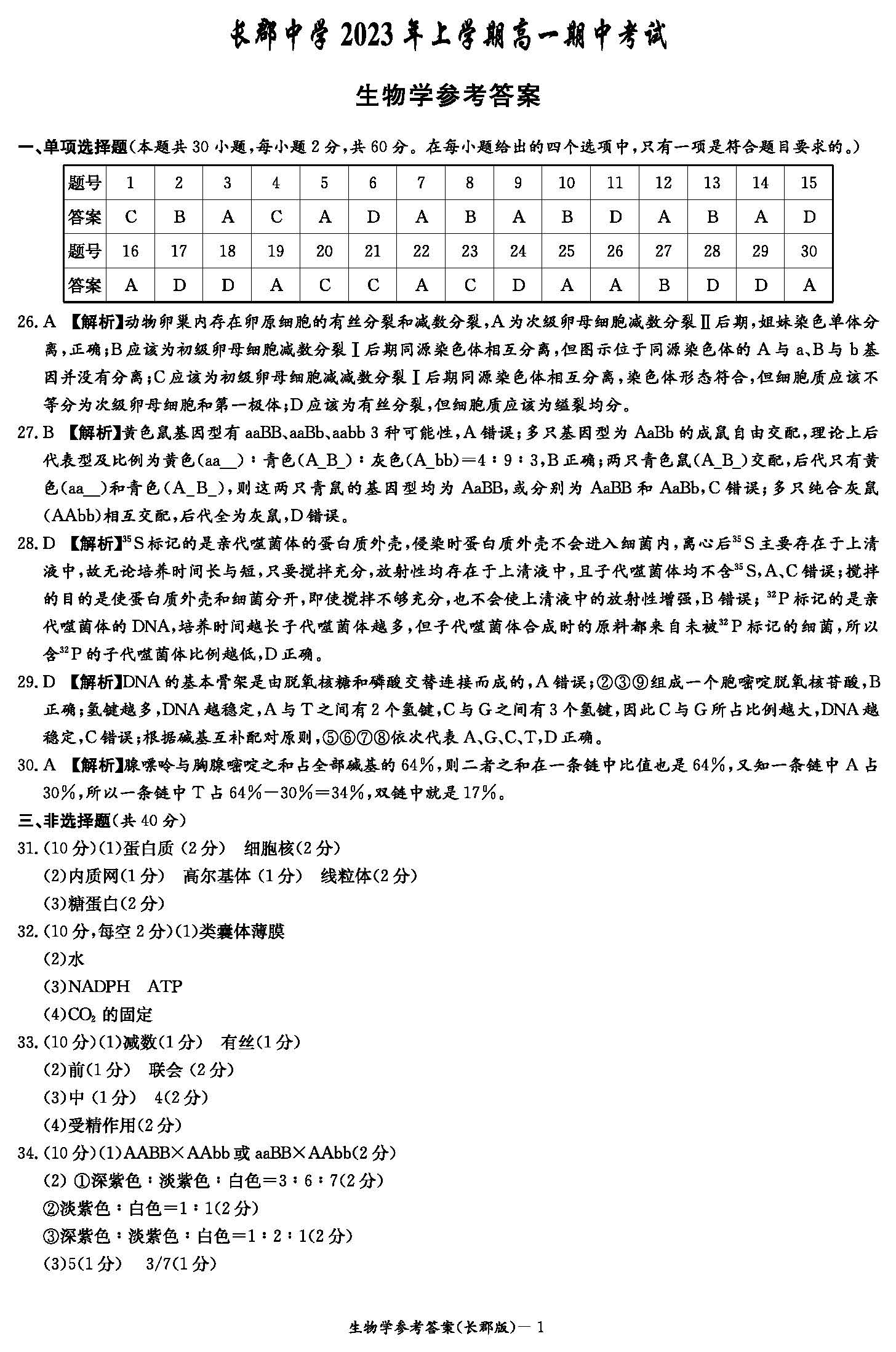 湖南省长沙市长郡中学2023学年高一下期中考试生物答案