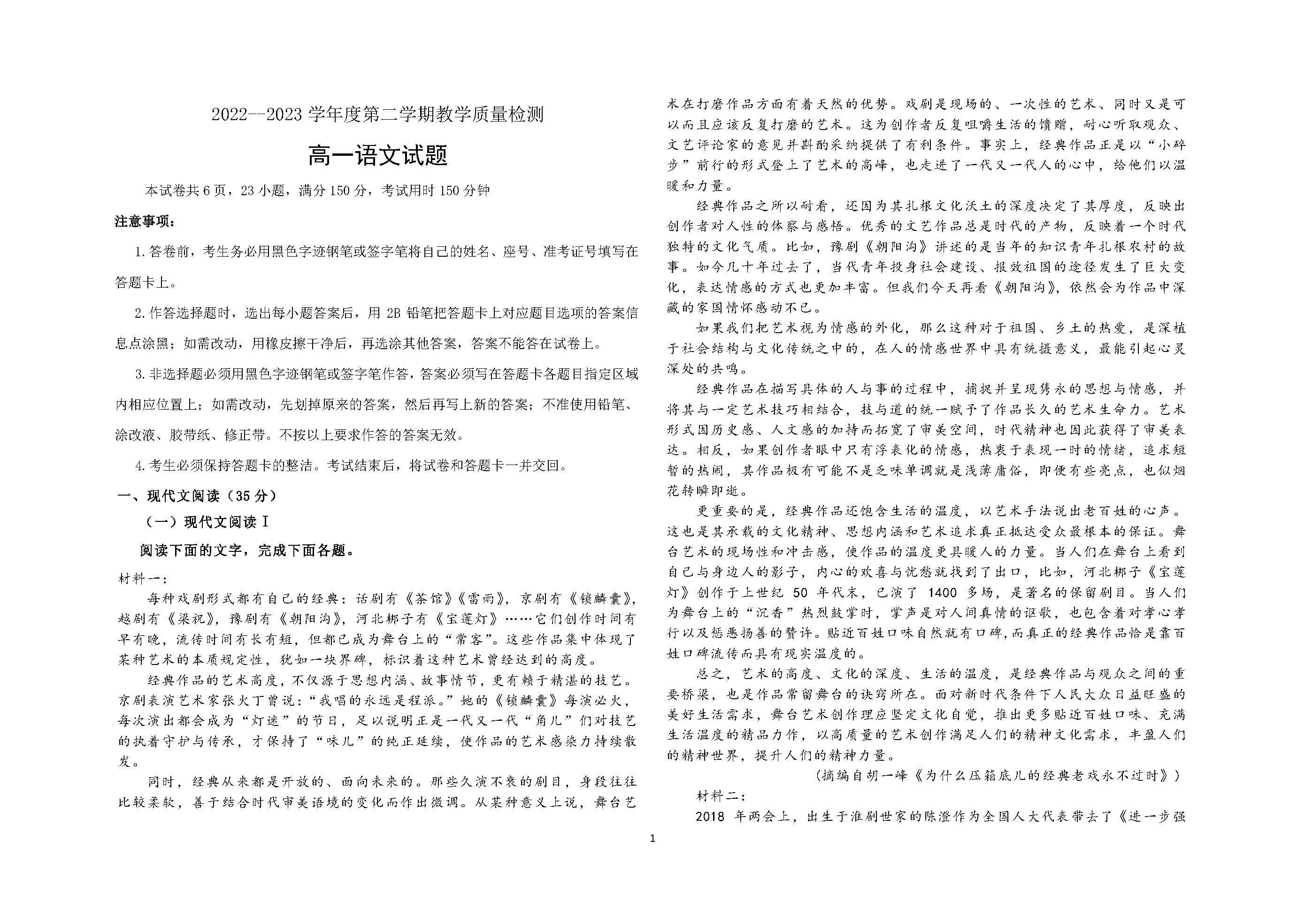 山东省聊城市第四中学2022-2023学年高一下学期5月月考语文试题