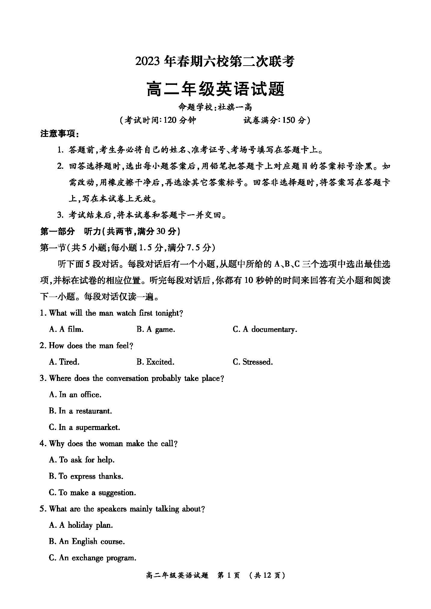 河南省南阳六校2023学年高二春季第二次联考英语试题