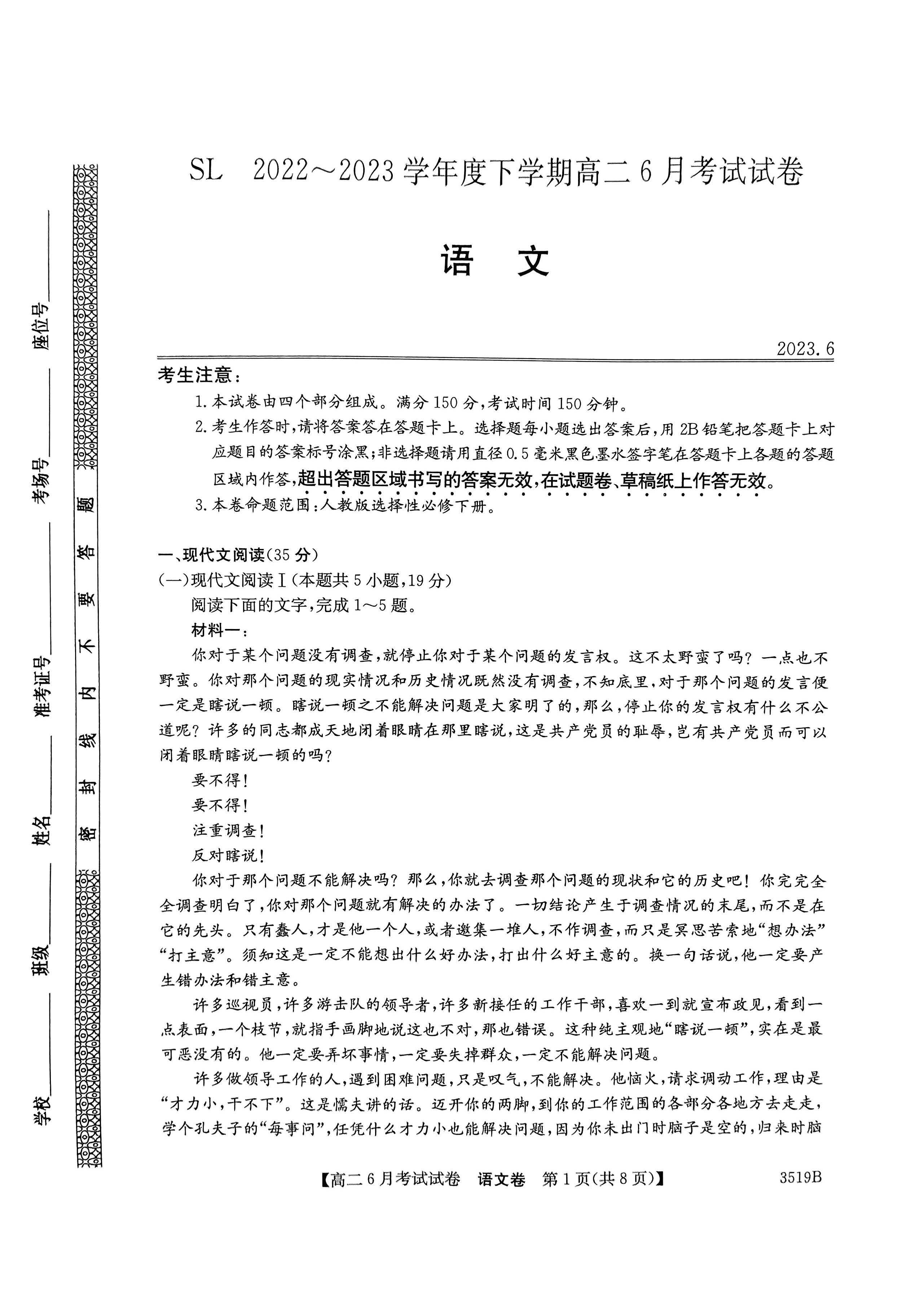 黑龙江省绥化市绥棱一中2023学年高二下6月月考语文试题