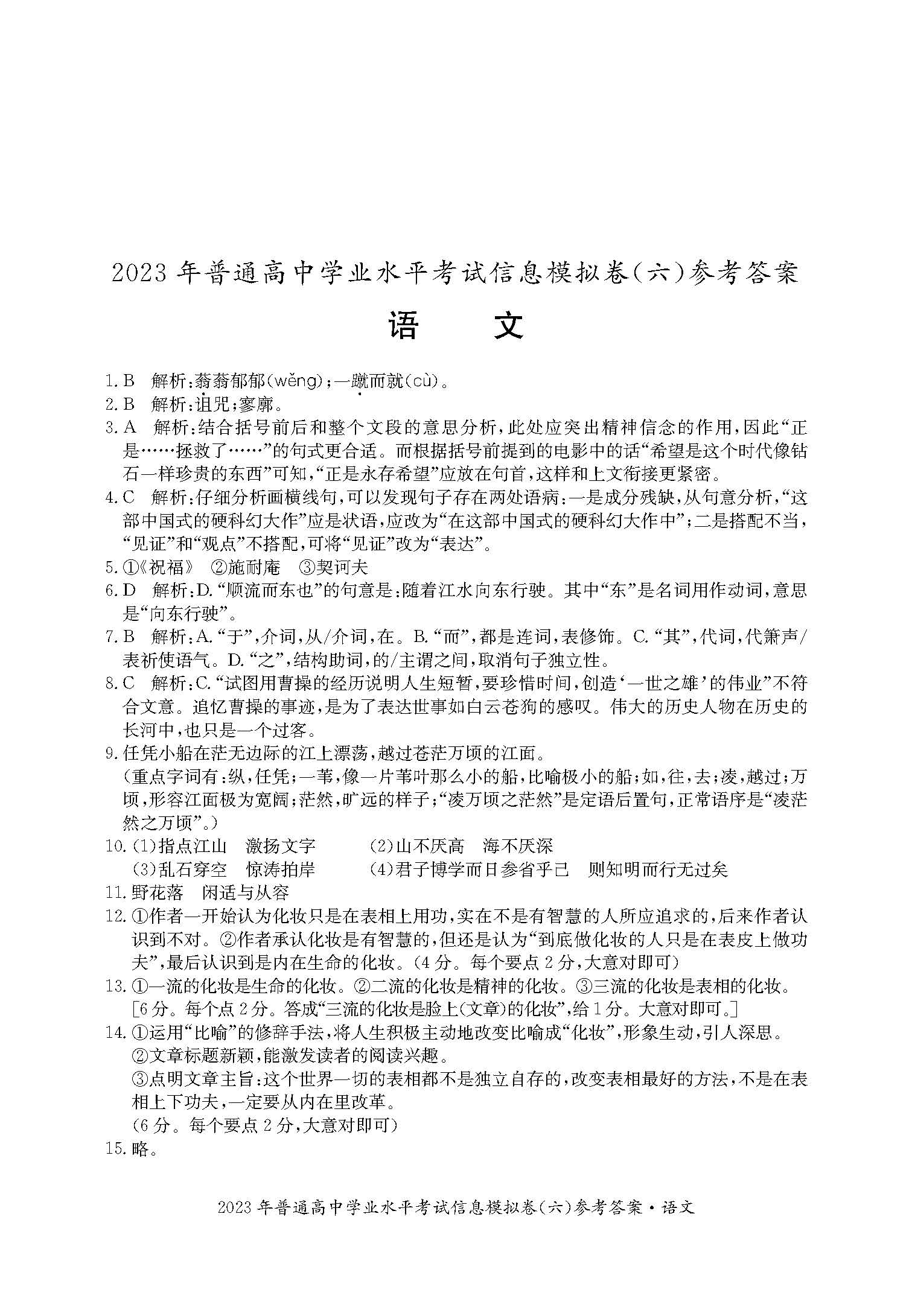 湖南省2023年普通高中学业水平考试信息模拟卷(六)语文答案