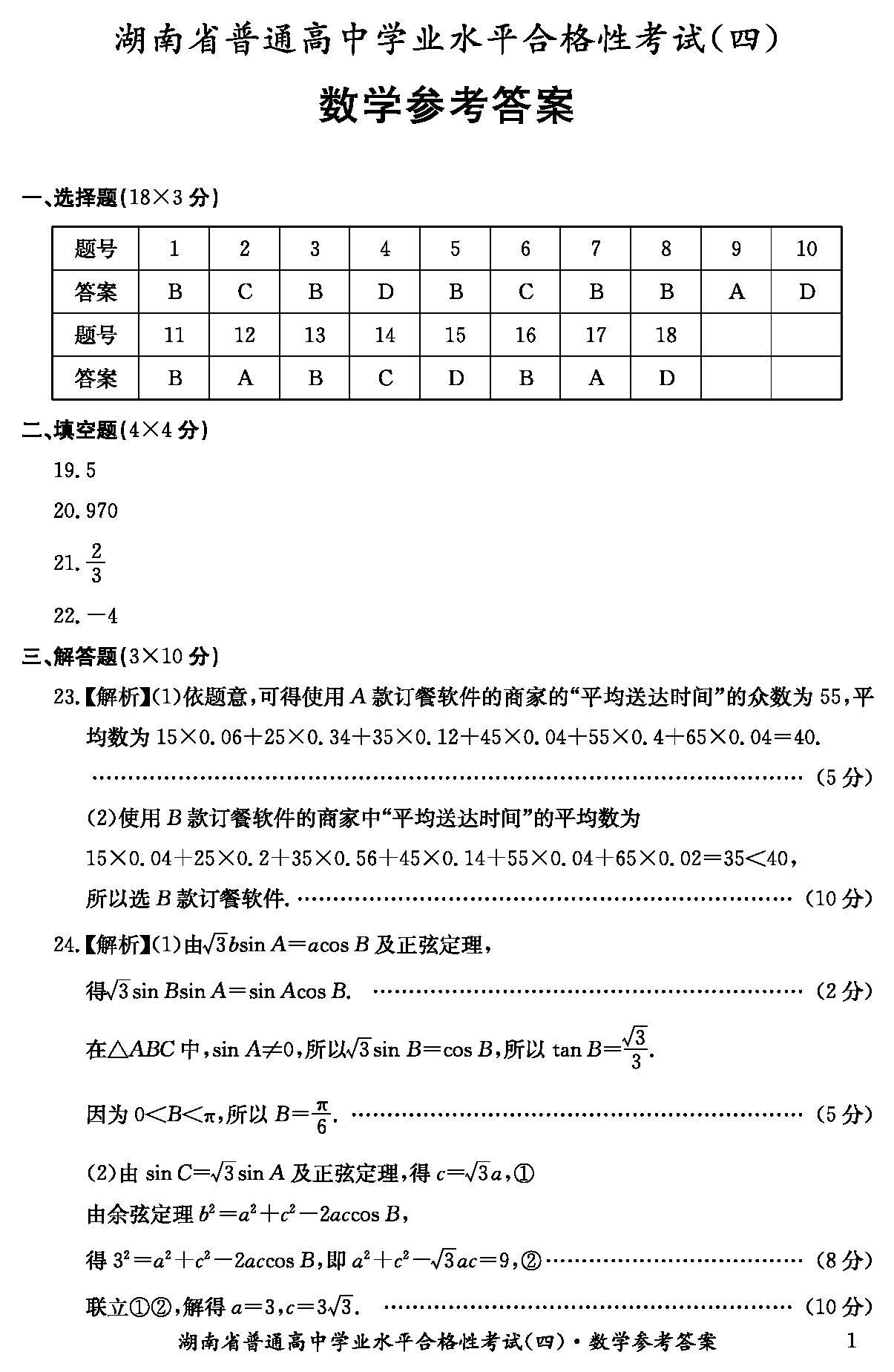 湖南省2023年普通高中学业水平合格性考试模拟卷(四)数学答案