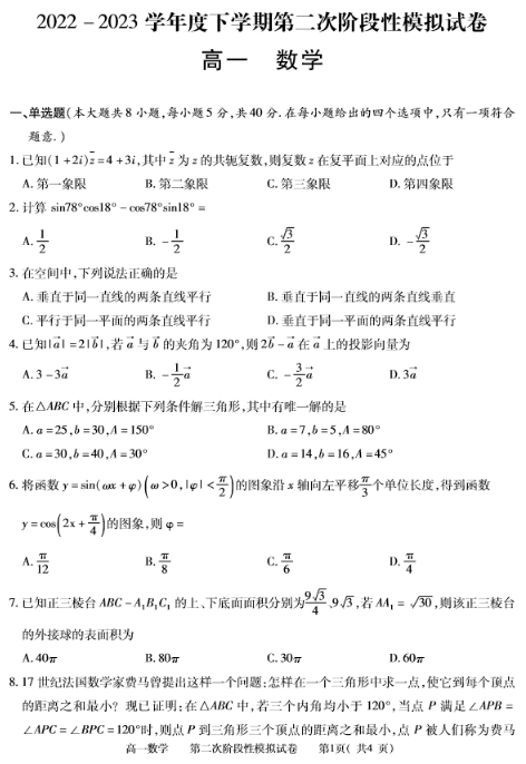 查看更多试题>>>全国2022-2023学年高一年级下学期期末试题及答案汇总