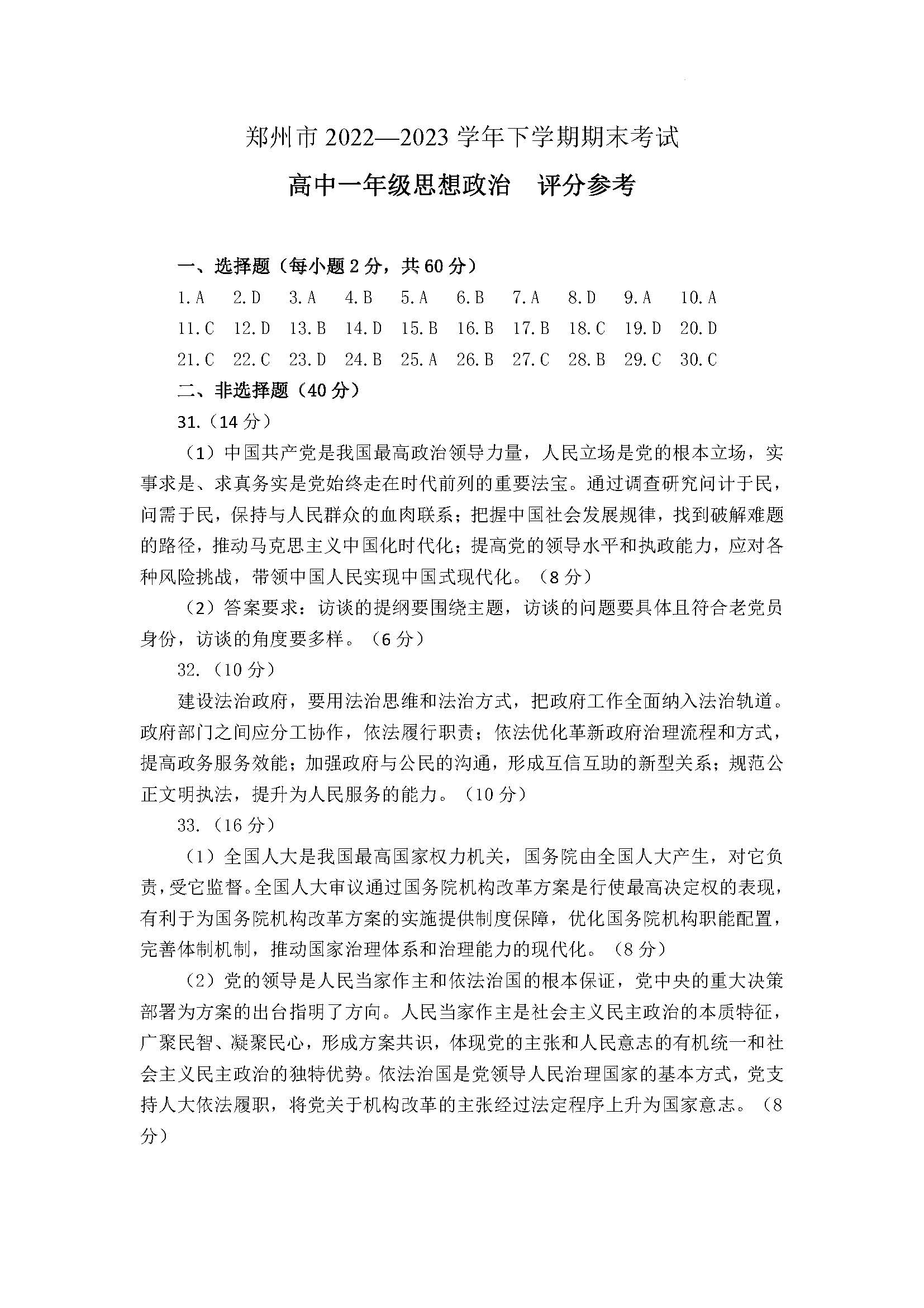 河南省郑州市2023学年高一下学期期末考试政治答案