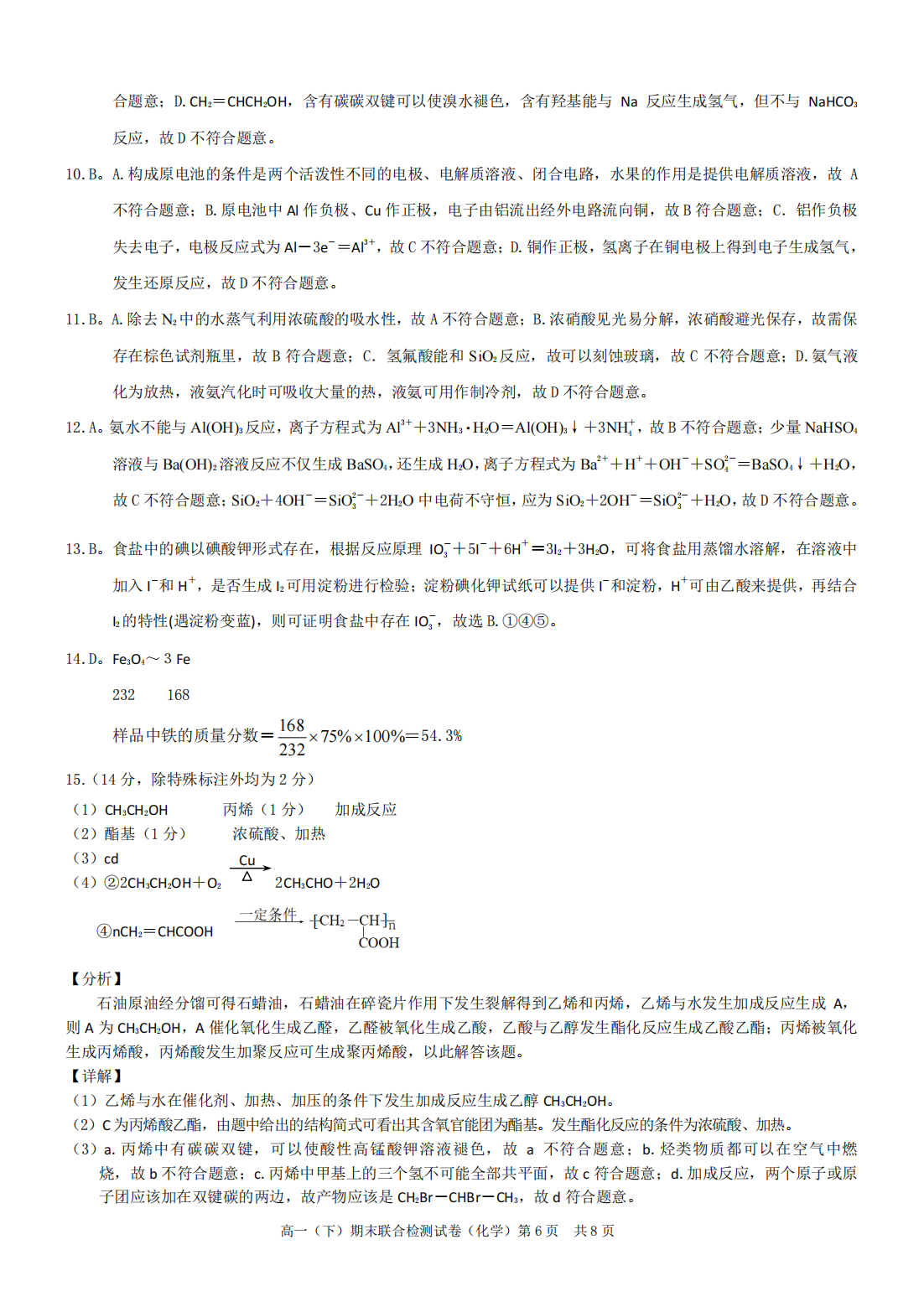 2023年重庆市高一下期末联合考试(康德卷)化学答案