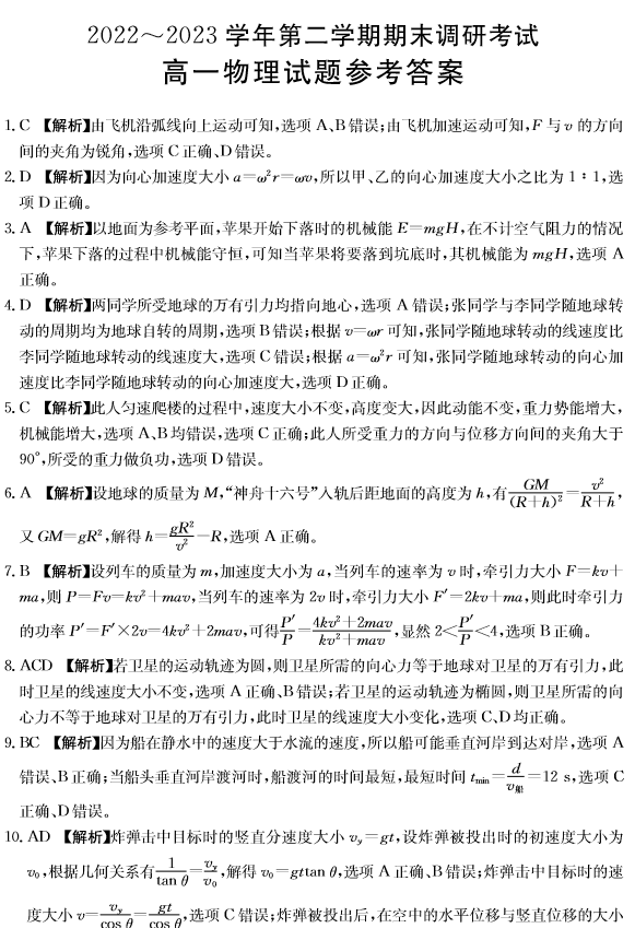 河北省2023年高一期末考试顺利结束!自主选拔在线团队同步整理了河北省2023年高一下学期期末考试物理试题答案,供大家下载!