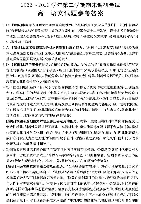 河北省2023年高一下学期期末考试语文试题答案