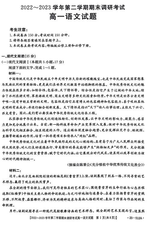 河北省2023年高一下学期期末考试语文试题