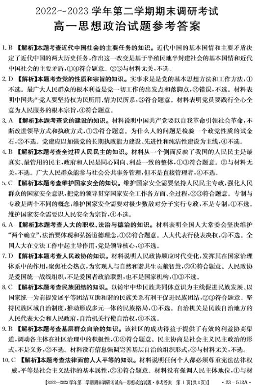 河北省2023年高一期末考试顺利结束!自主选拔在线团队同步整理了河北省2023年高一下学期期末考试政治试题答案,供大家下载!