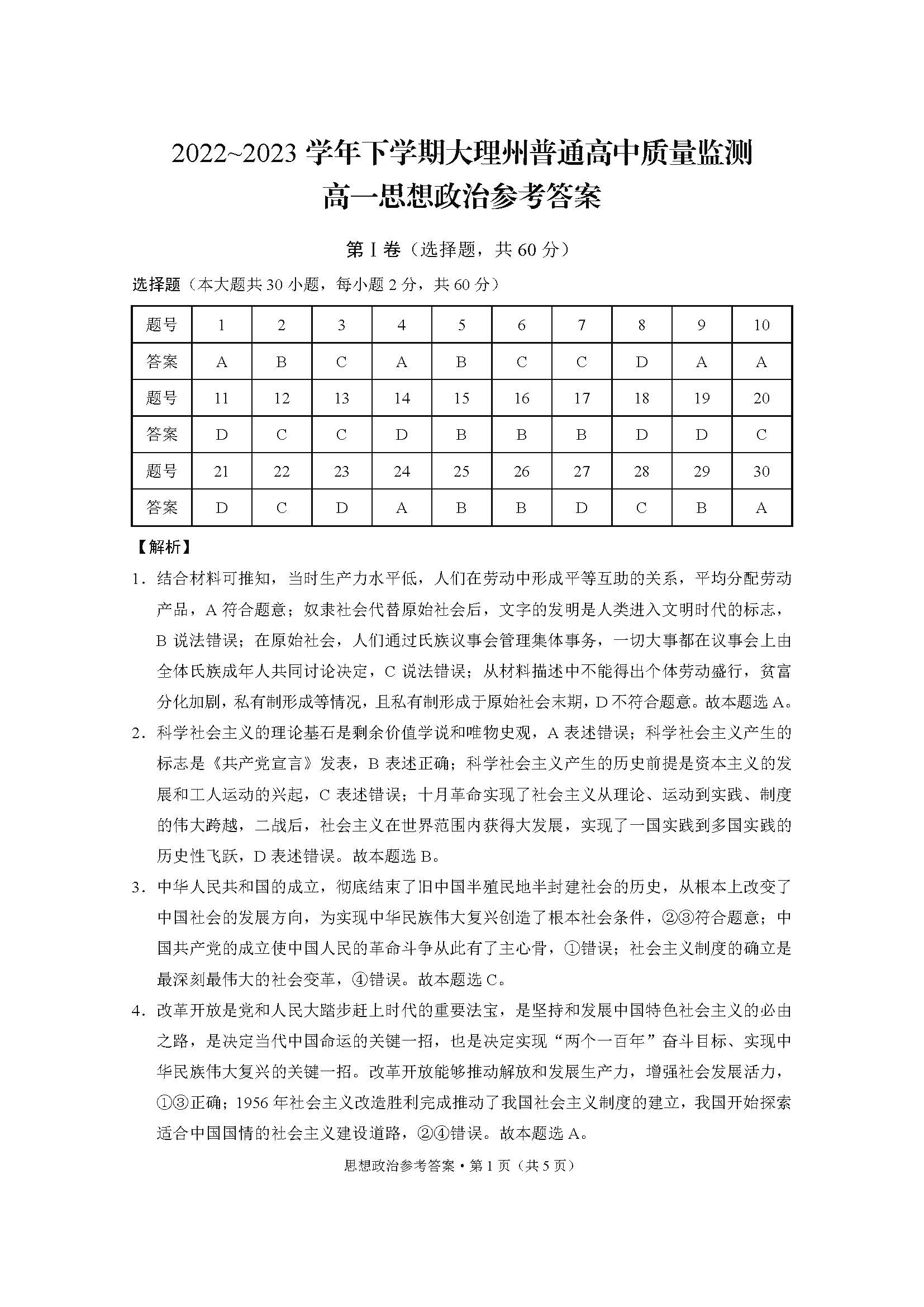 云南省大理州2022-2023学年高一下学期质量监测政治答案