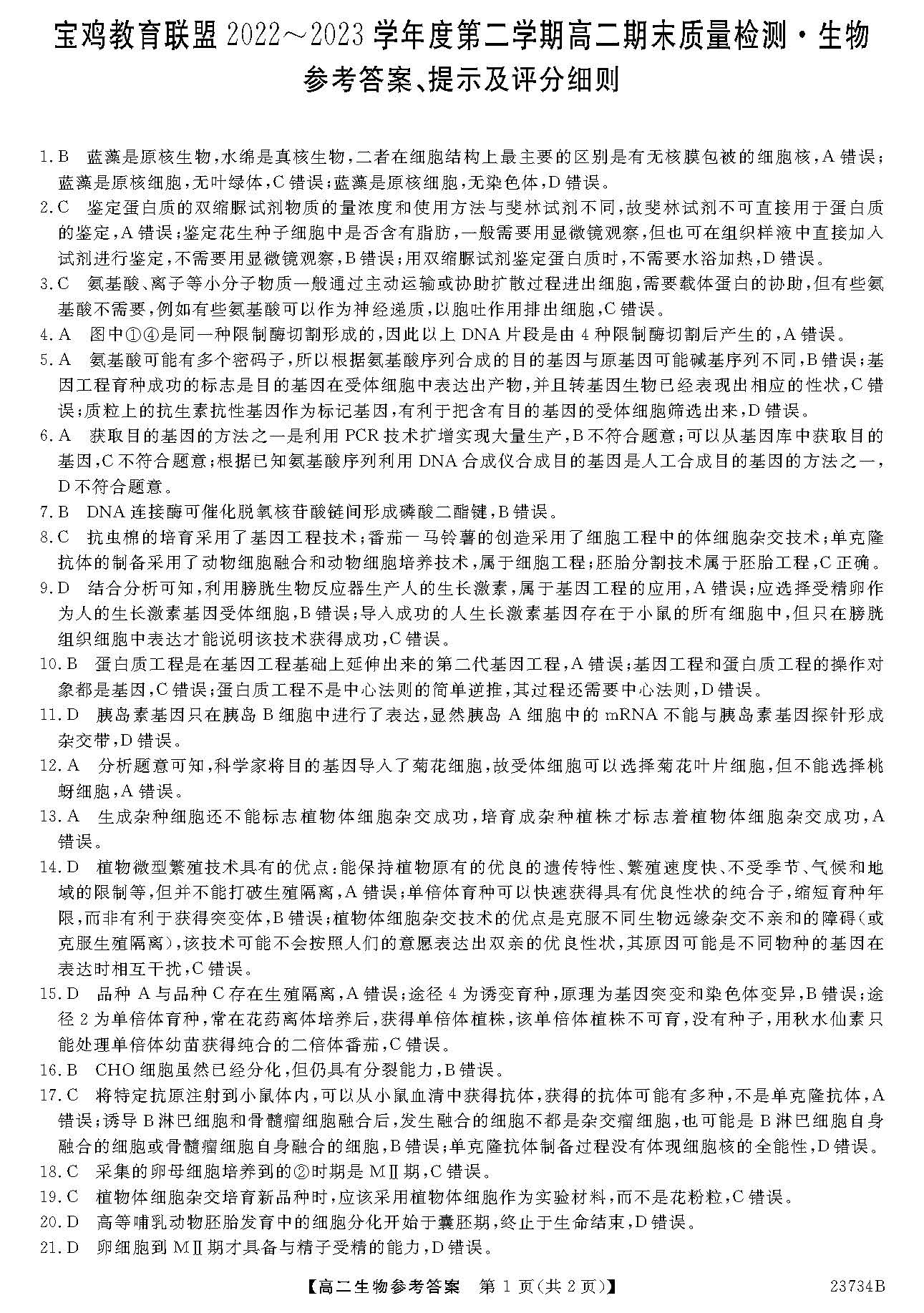 陕西省宝鸡教育联盟2023学年度第二学期高二期末生物答案
