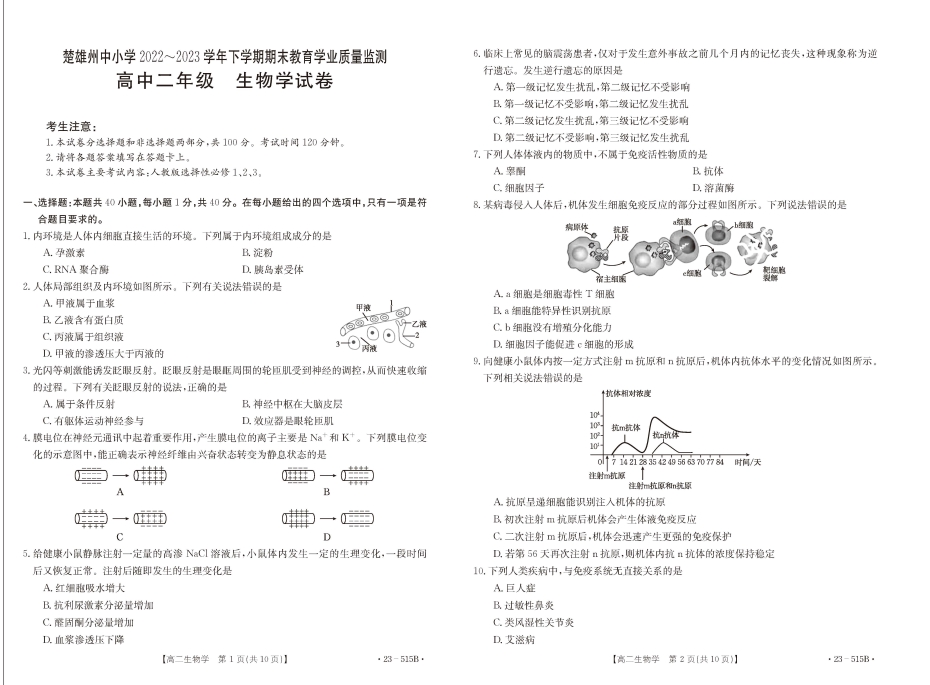 金太阳云南省楚雄州2022-2023学年高二下学期期末(515B)生物试题