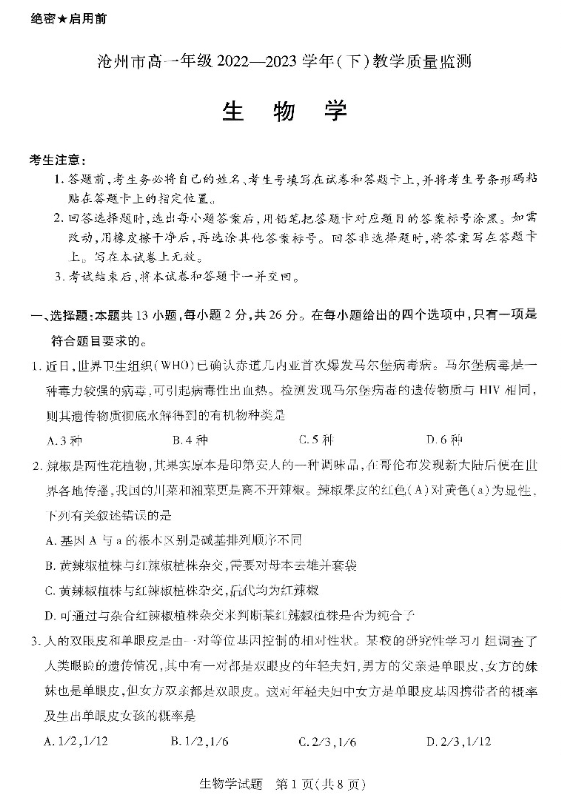 河北省沧州市2023年高一下学期期末考试生物试题