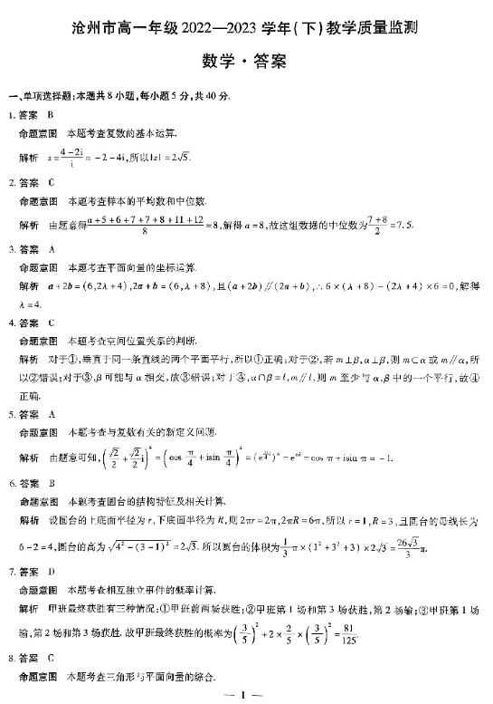 河北省沧州市2023年高一下学期期末考试数学试题答案