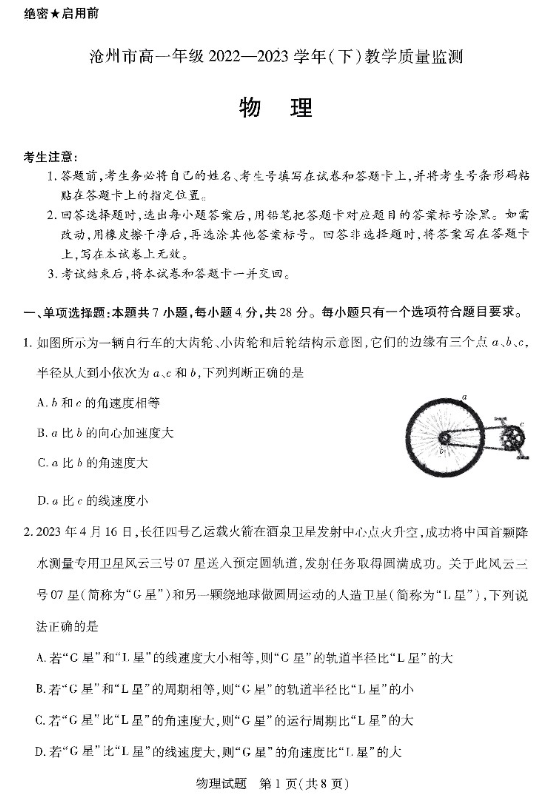 河北省沧州市2023年高一期末考试顺利结束!自主选拔在线团队同步整理了河北省沧州市2023年高一下学期期末考试物理试题,供大家下载!