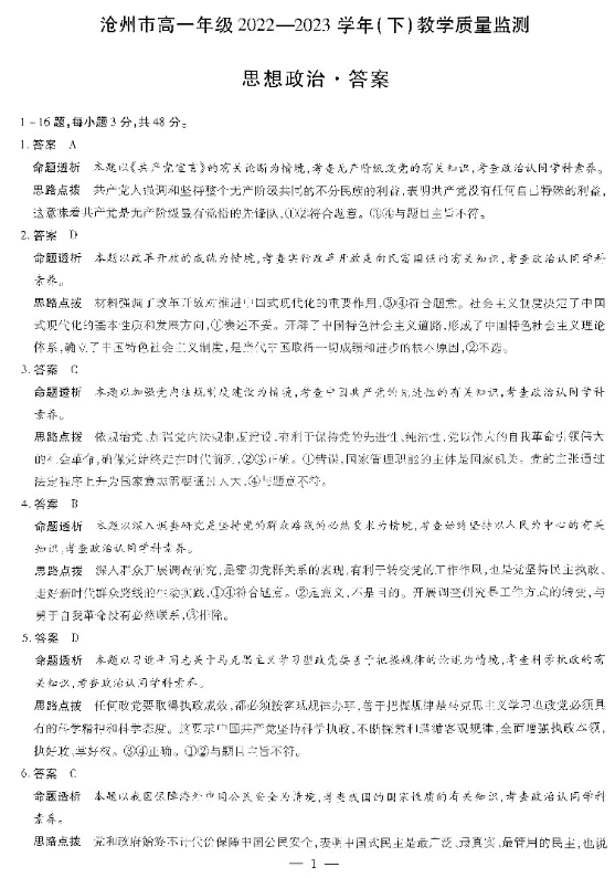 河北省沧州市2023年高一下学期期末考试政治试题答案