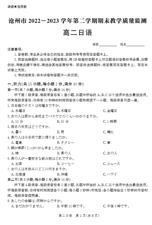 河北省沧州市2023年高二期末考试顺利结束!自主选拔在线团队同步整理了河北省沧州市2023年高二下学期期末考试日语试题,供大家下载!