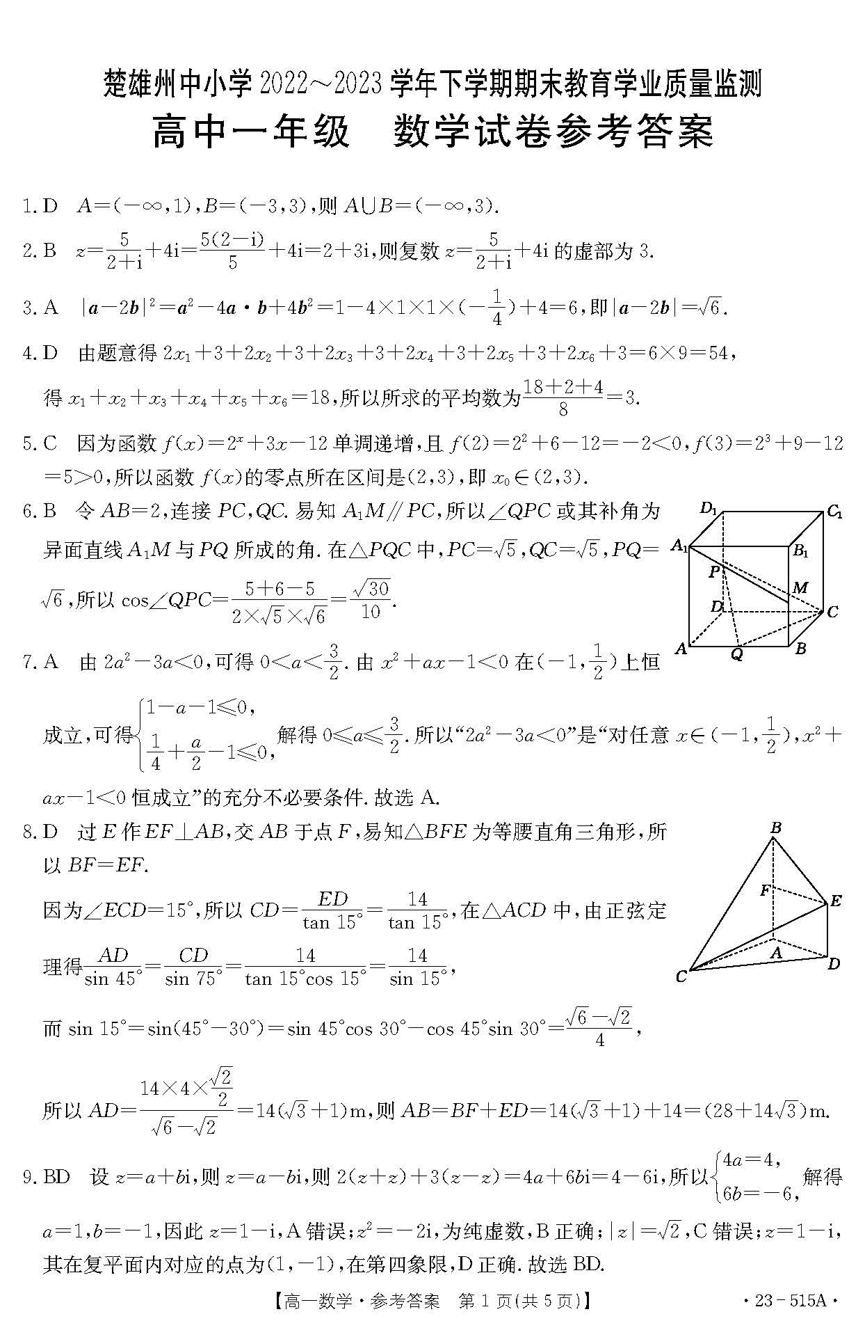 金太阳云南省楚雄州2022-2023学年高一下学期期末(515A)数学答案