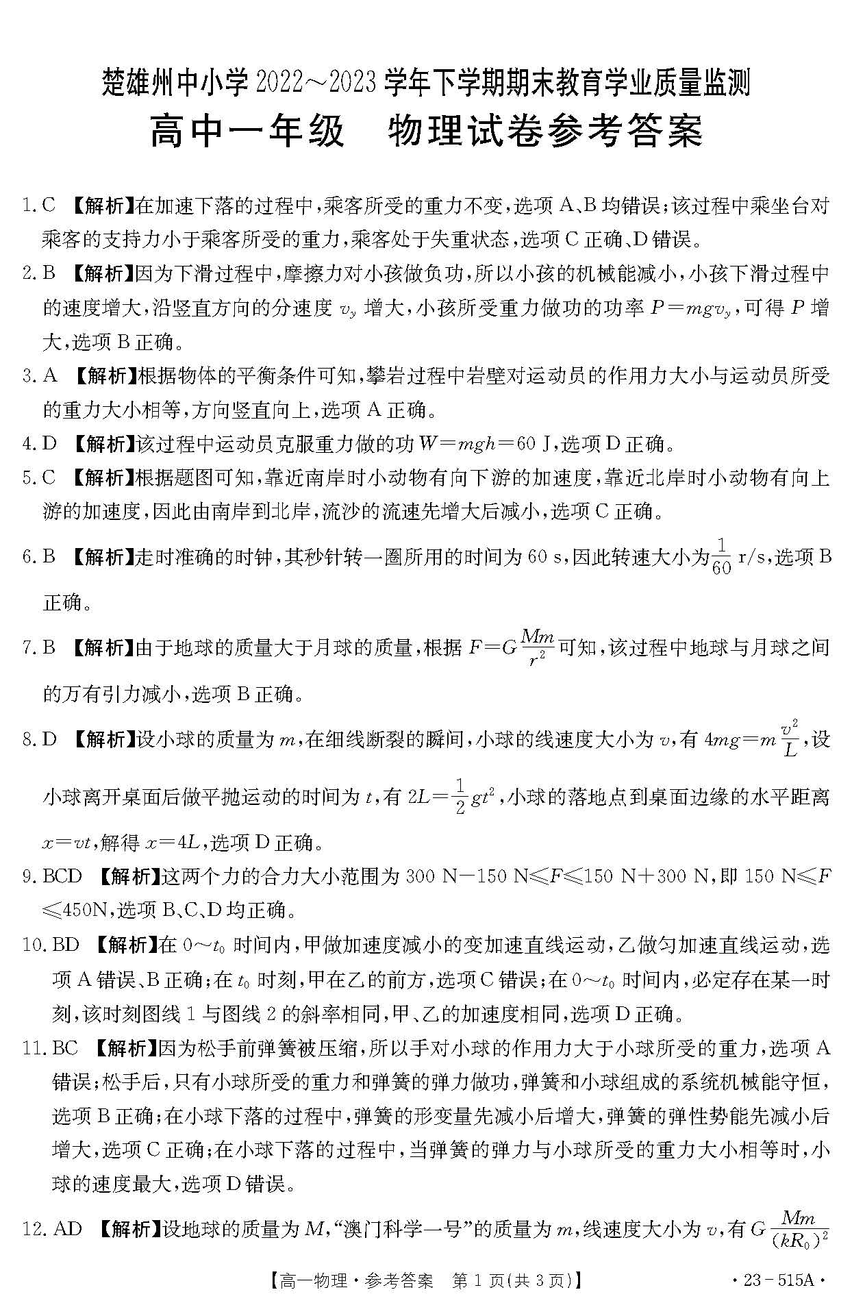 金太阳云南省楚雄州2022-2023学年高一下学期期末(515A)物理答案