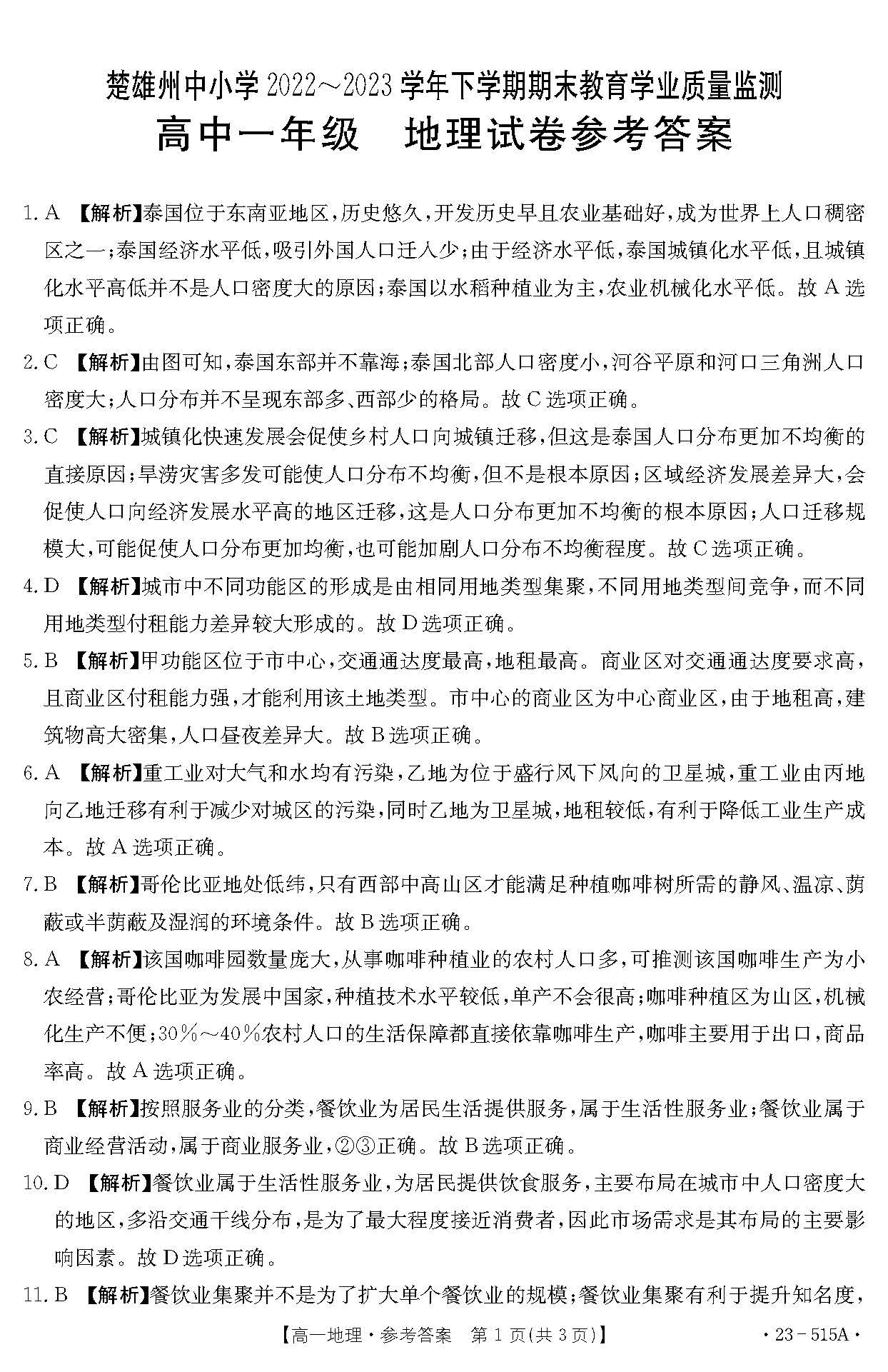 金太阳云南省楚雄州2022-2023学年高一下学期期末(515A)地理答案