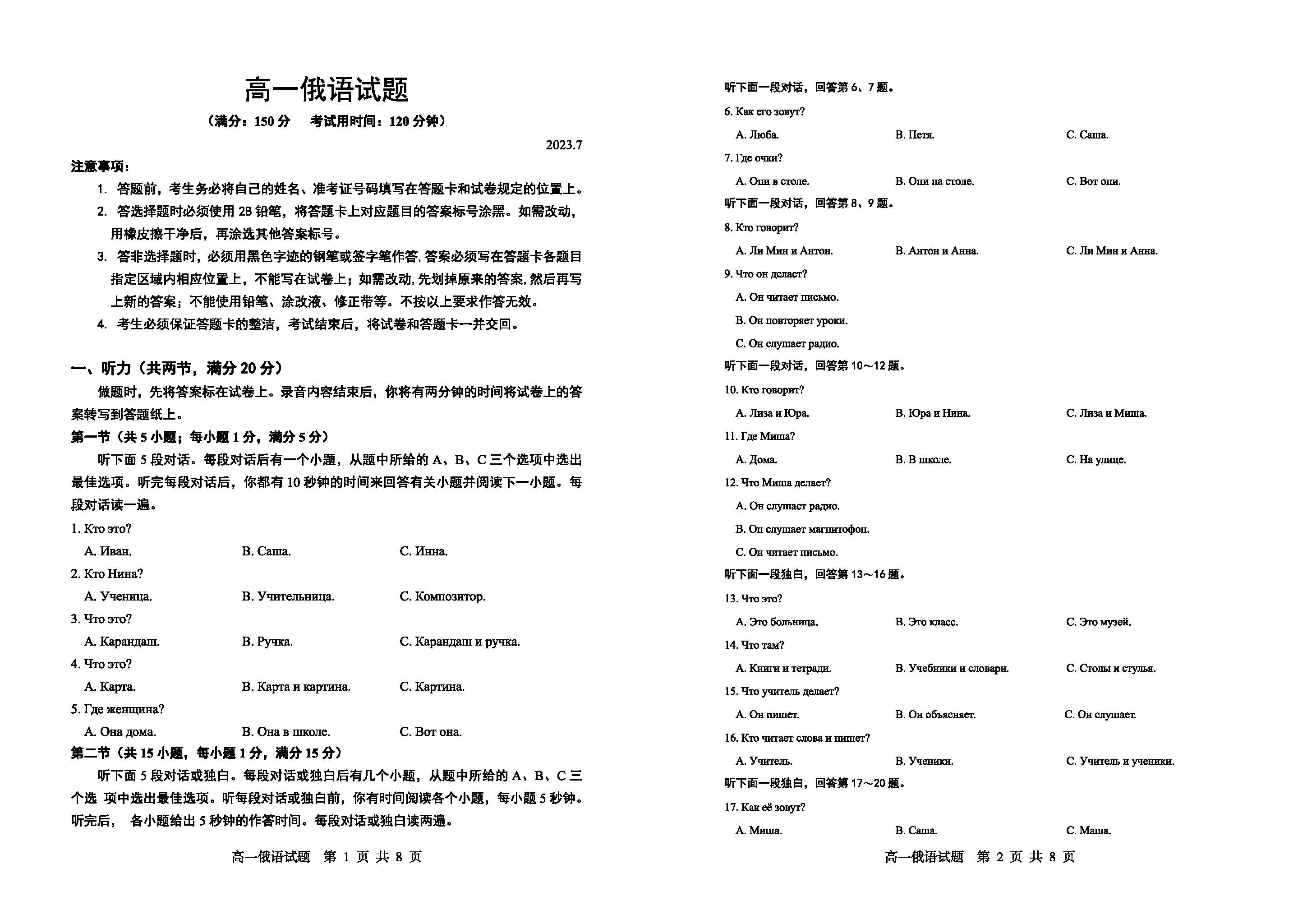 山东省滨州市2022-2023学年高一下学期期末俄语试题