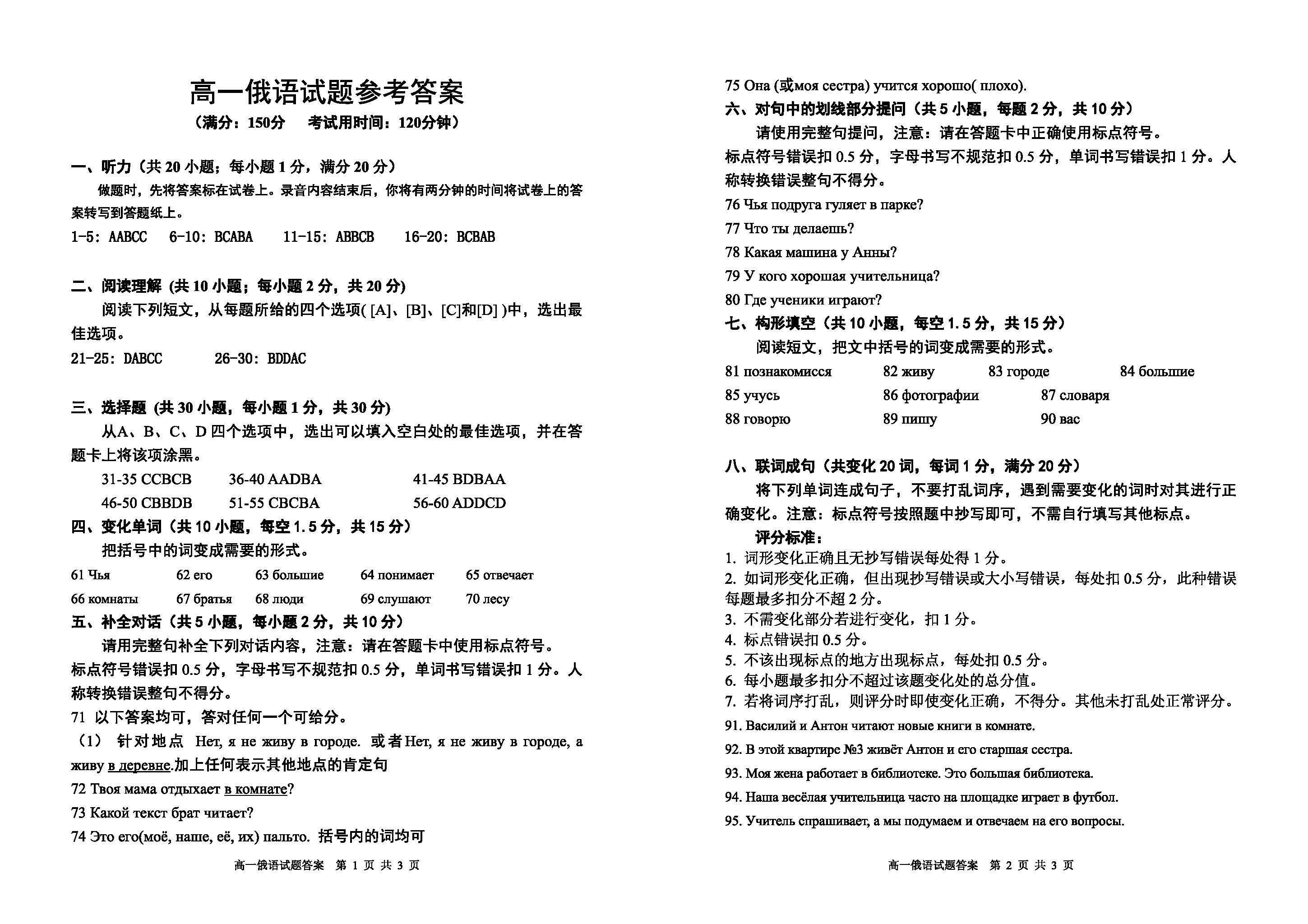 山东省滨州市2022-2023学年高一下学期期末俄语答案