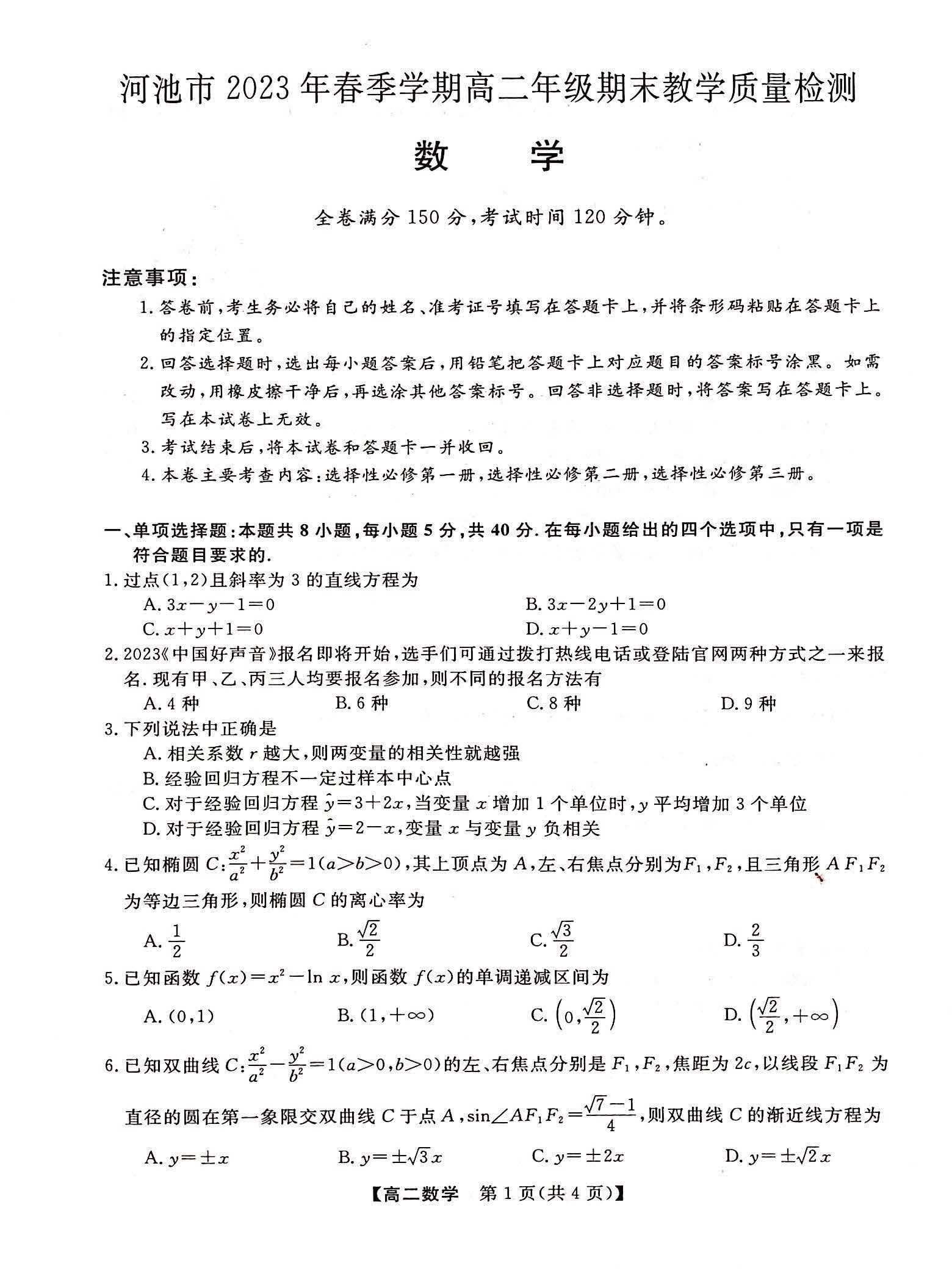 广西河池市2022-2023学年高二下期末质量检测数学试题