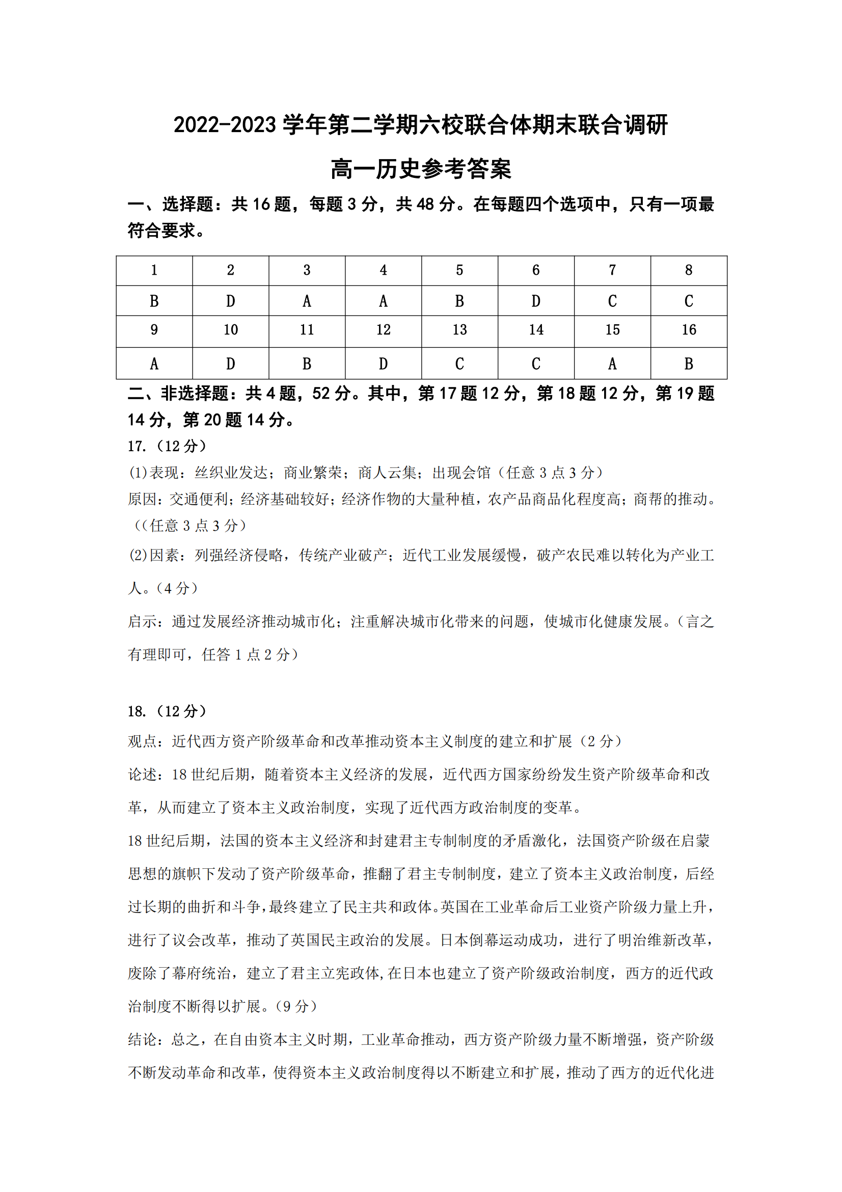江苏南京六校联合体2023年高一下学期期末考试历史试题答案