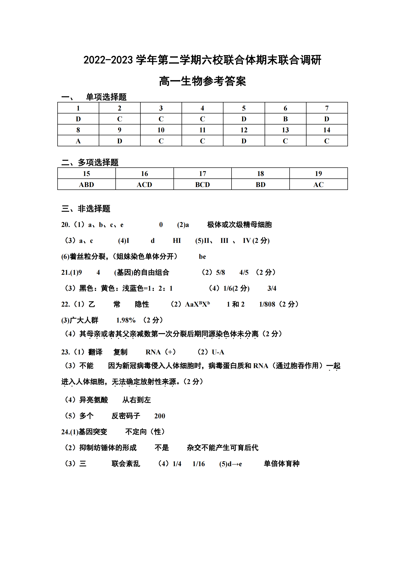 江苏南京六校联合体2023年高一下学期期末考试生物试题答案