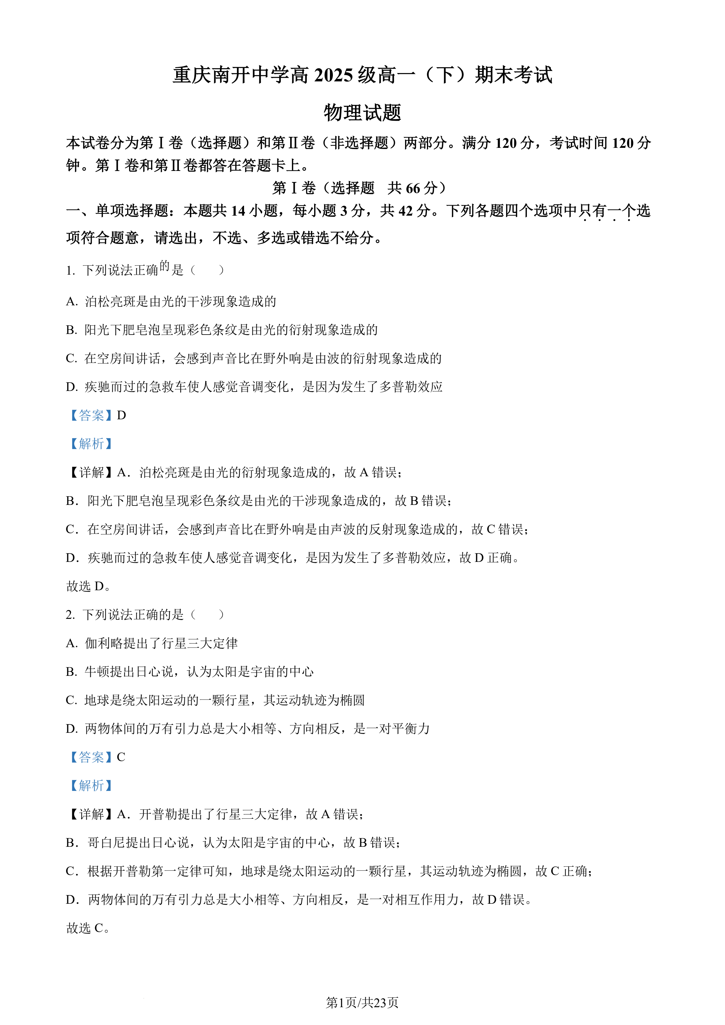 重庆南开中学2023年高一下学期期末考试物理试题答案
