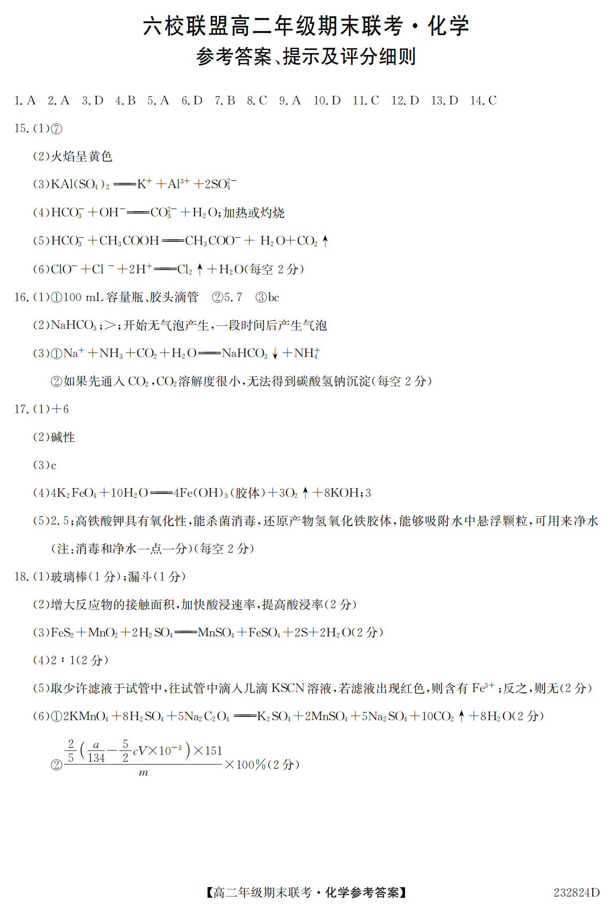 保定六校联盟2023高二年级期末考试化学试题答案