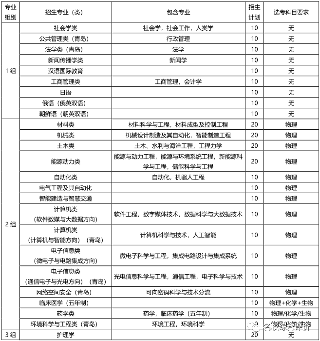 注1:考生只能报考其中一个组别的专业,最多可报6个专业志愿,并可选择是否服从专业调剂(同组内调剂);根据生源情况,各专业招生计划可适当调整;最终招生专业及计划以山东省教育招生考试院公布为准。