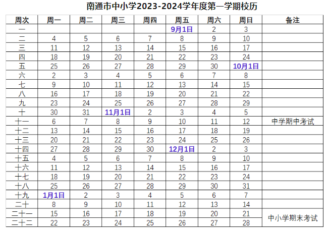 根据南通市教育局公布的校历,2023年全市中小学幼儿园秋季开学报到时间为9月1日,上课时间为9月4日。2024年寒假放假时间拟定为1月29日,春季开学报到时间拟定为2月18日,上课时间拟定为2月19日。