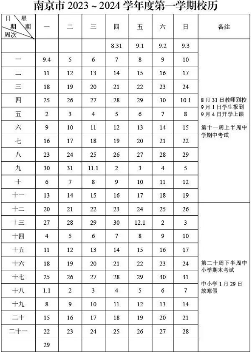 从校历看,第一学期从2023年9月4日至2024年1月28日结束,实际教学时间100天。中小学第二十周下半周(1月17-19日)安排期末考试,2024年1月29日起全市中小学幼儿园放寒假。南京市教育局要求各区教育局和中小学要严格执行校历规定,不得随意更改日程安排。