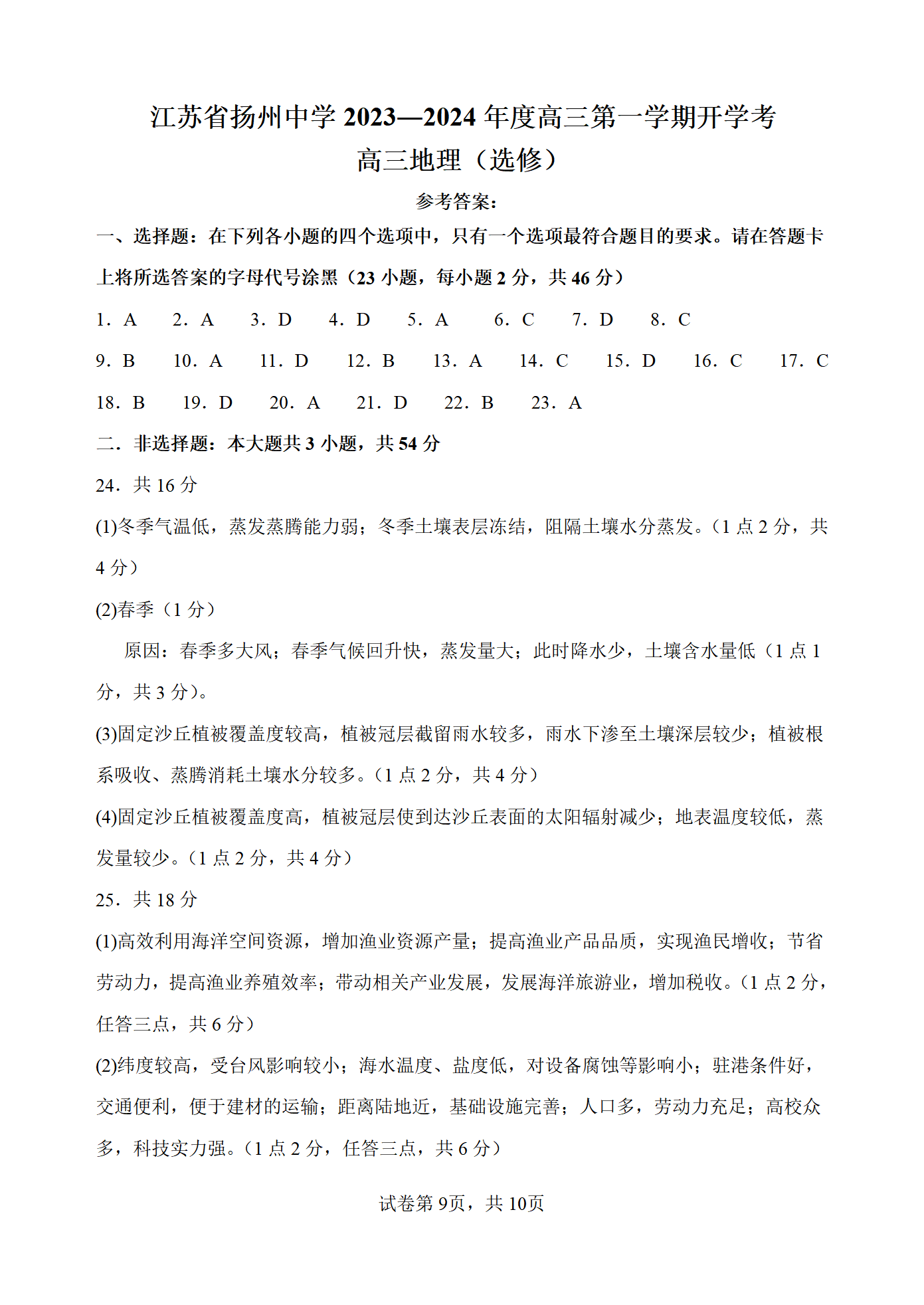 江苏省扬州中学2024届高三上学期开学地理试题答案