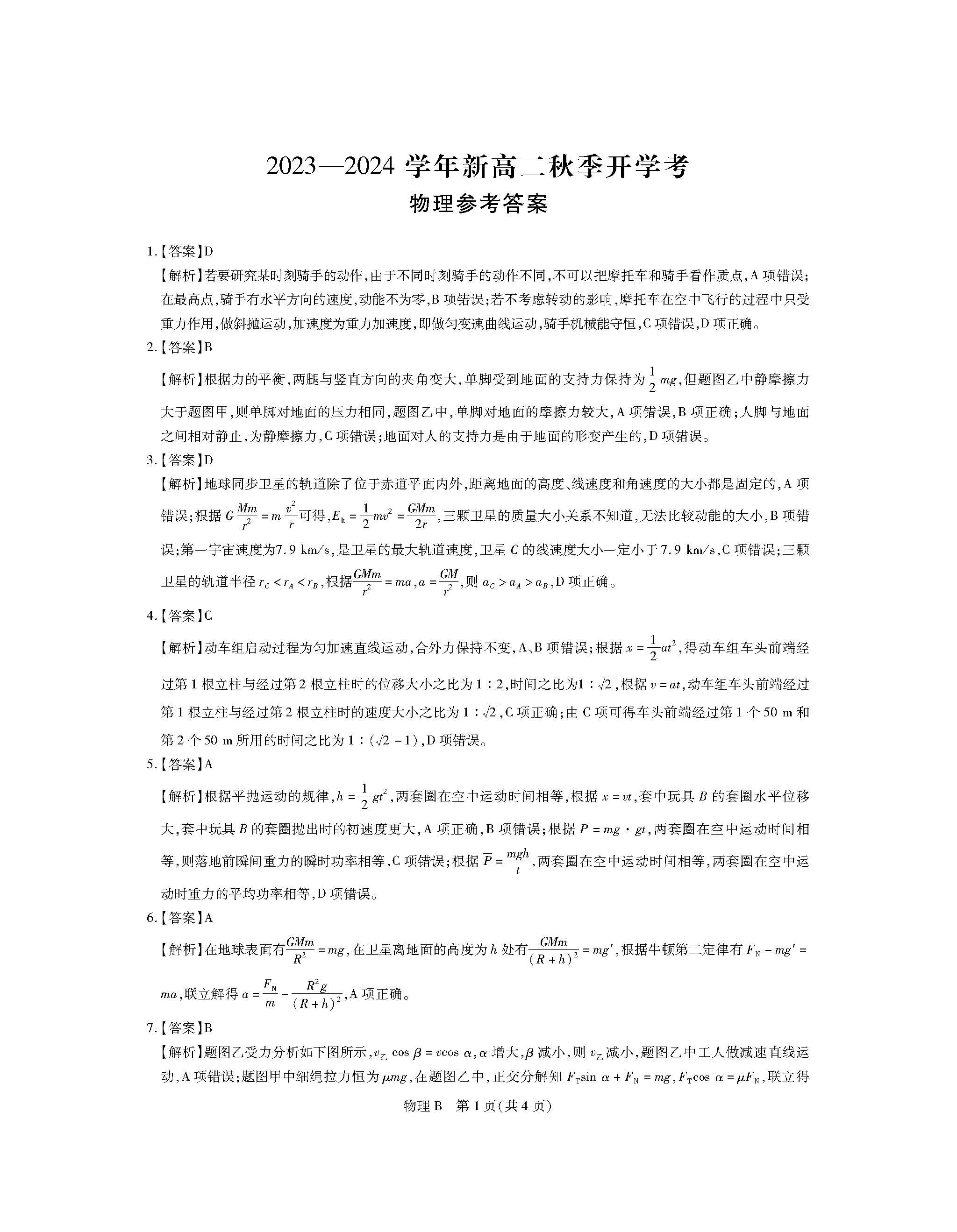 江西省稳派2023-2024学年高二上学期开学考试物理答案
