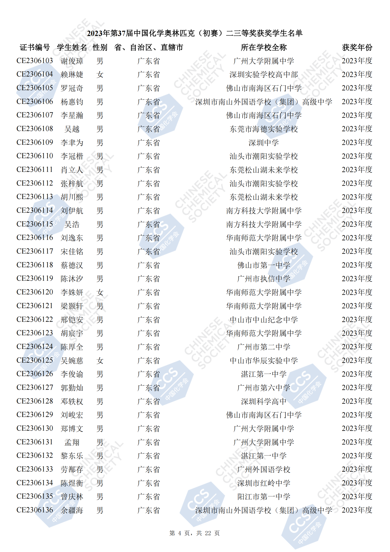 广东省2023年第37届全国中学生化学竞赛初赛省二获奖名单