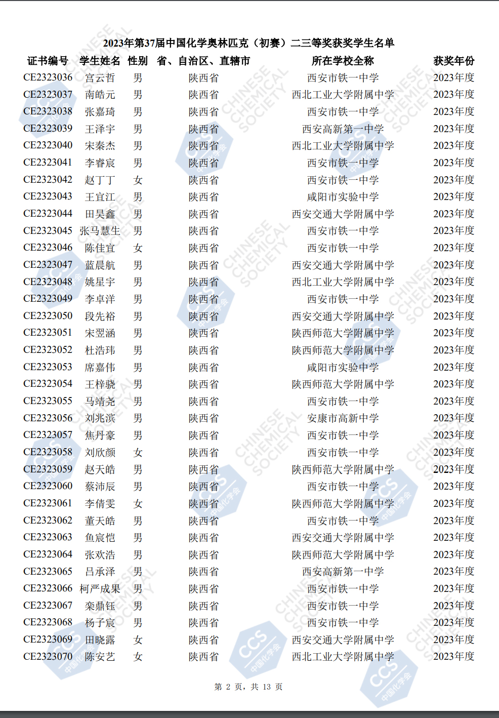陕西省2023年第37届全国中学生化学竞赛初赛省二获奖名单