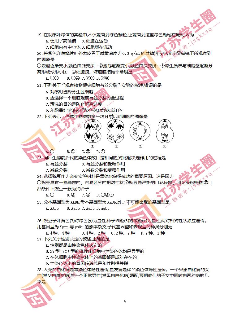 江苏省2022年普通高中学业水平合格性考试生物试题答案