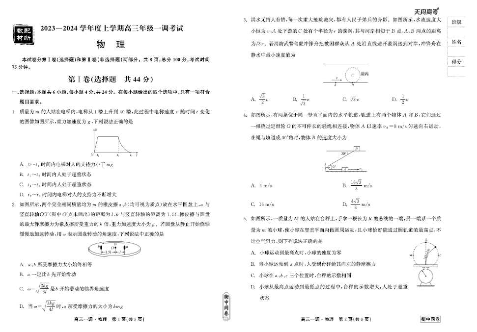 衡中同卷2024届高三年级一调考试(新高考)物理试题