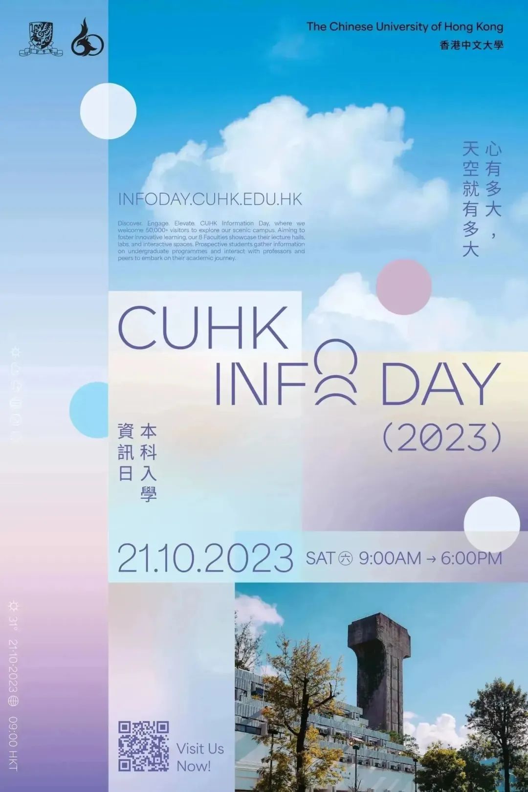 香港中文大学2023本科入学资讯日来啦!香港中文大学将于10月21日(星期六)上午9时至下午6时开放校园,自主选拔在线将汇总整理香港中文大学2023本科校园开放日资讯,推荐关注。