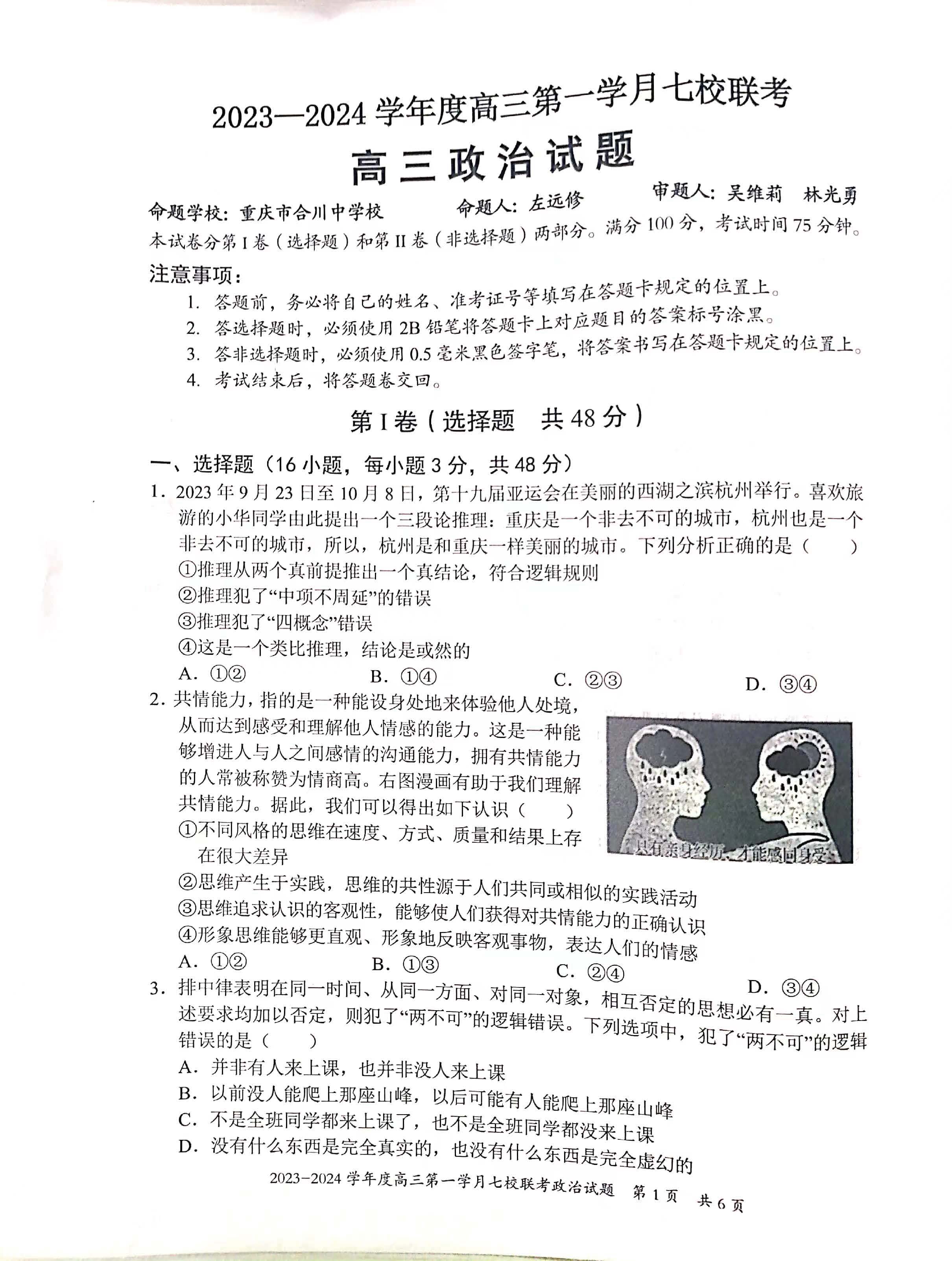 重庆市七校联考2024届高三上学期第一次月考政治试题